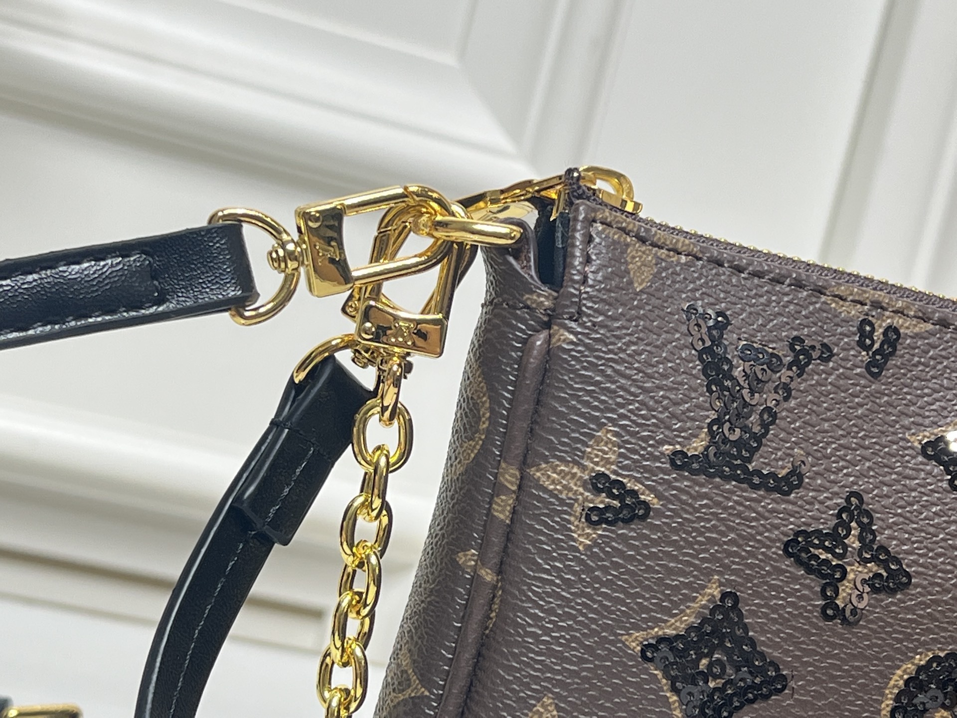 ルイ・ヴィトンの象徴である「モノグラム」パターンと、現代的な「ブラックスパンコール」を融合させたマージャンバッグ。復古的な趣とモダンなデザインのバランスが特徴で、日常から特別なイベントまで幅広く対応します。シンプルなシルエットに立体感のあるスパンコール加工が施され、都会的なエレガンスを演出。