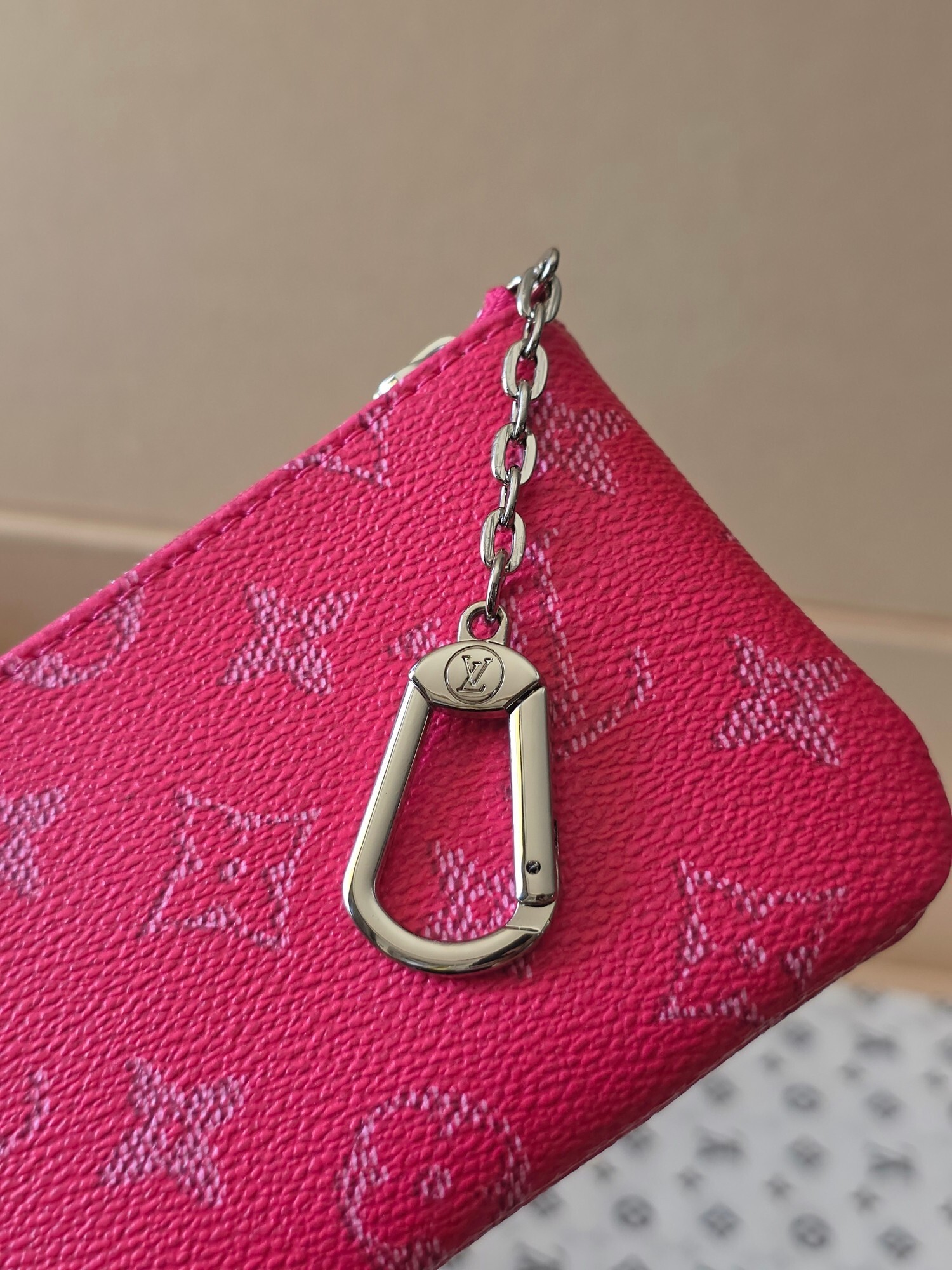 LVマゼンタ・メタリック拉鏈デザインバッグは、モノグラムキャンバスと高級感あるメタリック素材を組み合わせた超ミニサイズバッグです。シグネチャーLVモノグラムパターンが施されたメタリック拉鏈と、LV革製の拉鏈ノブが、ブランドらしい高級感を演出しています。側面には取り外し可能なメタリックチェーンが装備され、バッグの一部として使用するだけでなく、ショルダーチェーンやウォレットチェーンとしても活用可能です。