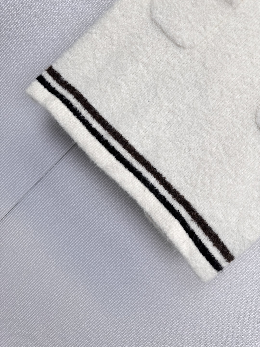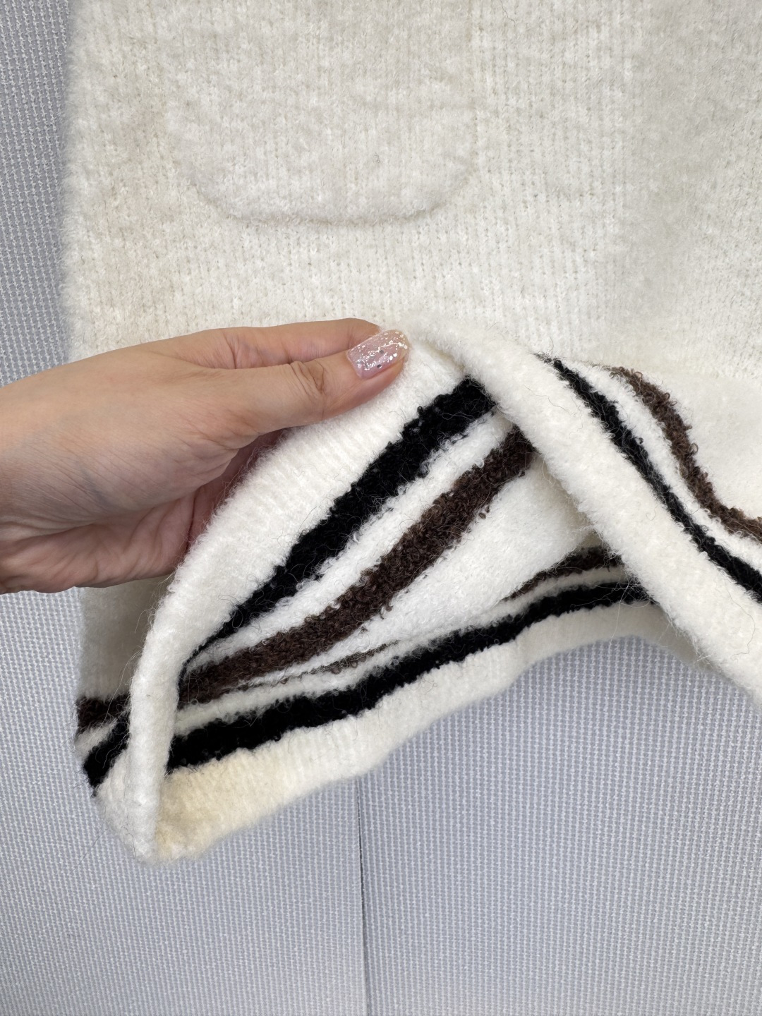 ・高密度ニット編み:縦横に交錯する平編みが、ストライプ部分の立体感を強調。光の角度で変化する「微妙な陰影」が、シンプルながらも豊かな表情を生む