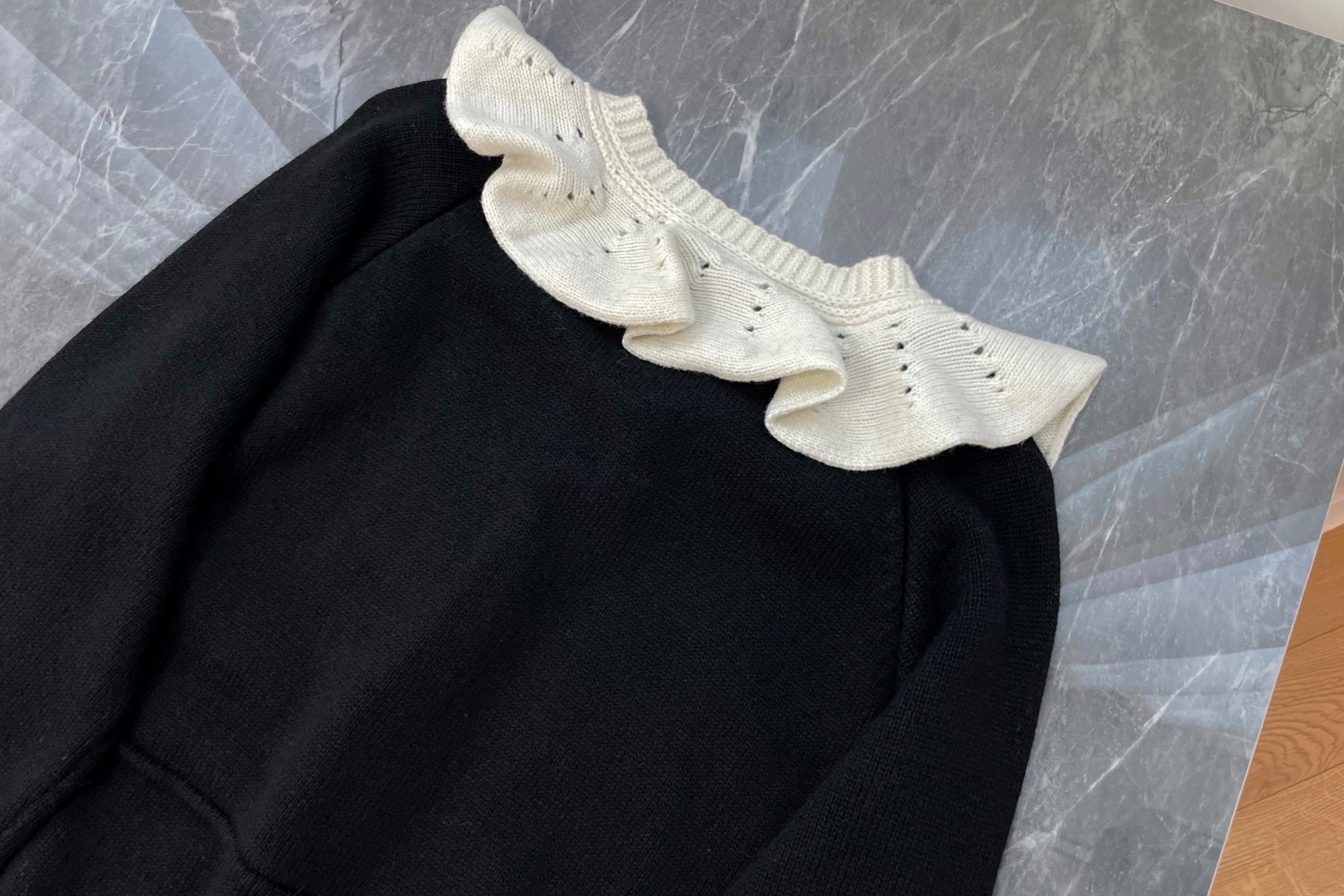 ・撞色の視覚詩:ブラックの縦縞とクリームホワイトの横縞が交差する「ストライプ撞色」が、光の下で「陰影のグラデーション」を生む。遠目にはクラシックなフレンチスタイルの雰囲気、近くで見れば繊細な編み目の凹凸が「手作業の温もり」を感じさせる。