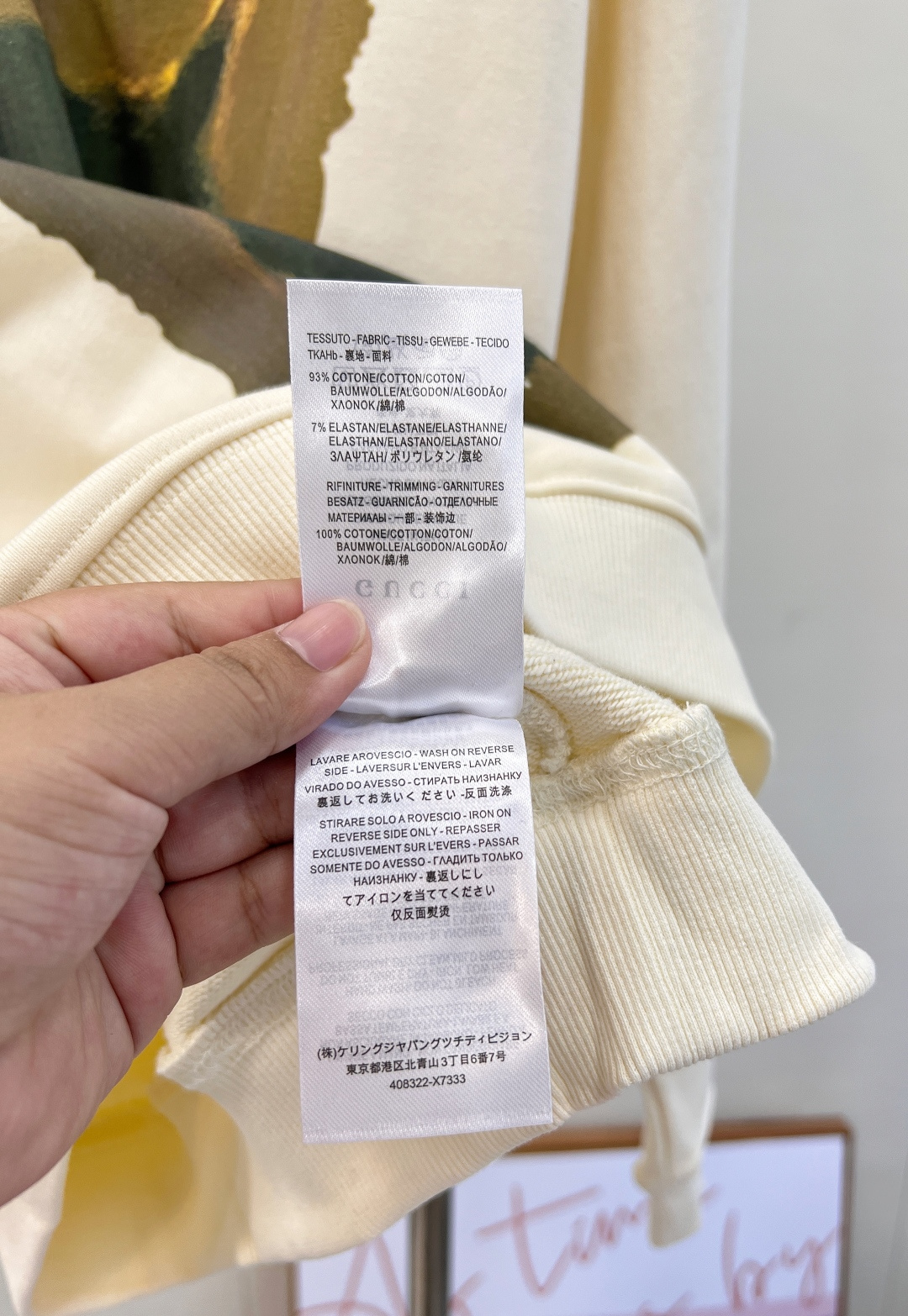 ・油絵調の猫プリントが全面を彩る独創デザイン。筆触の粗さや色彩の濃淡が本物の油絵のように立体感を演出し、猫の愛らしい表情が「癒しと芸術」を同時に届けます。プリントの周囲にはGUCCIのクラシックアルファベットを控えめに配置し、ブランドのDNAをさりげなく主張。アート好きもファッショニスタも心を掴む、唯一無二の図案です。