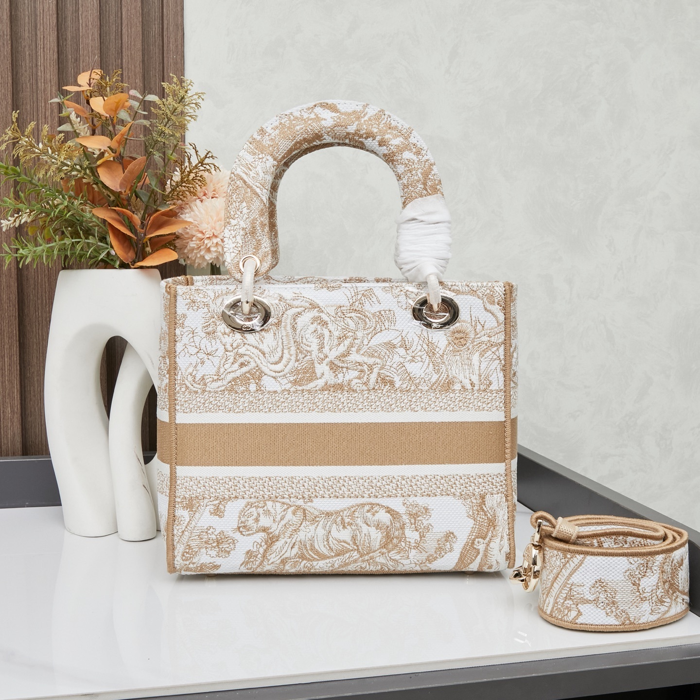 Lady D シリーズは「女性の優雅さを象徴する」ブランドの看板コレクションです。この刺繍シリーズは、その哲学に「自然との共生」を加え、刺繍の手仕事の温もりと布地の柔らかさが生む「新たなエレガンス」を追求。ライトゴールドの色調、蔓の刺繍、二重ストラップの実用性が融合し、「持つだけで自然の息吹を感じる」アイテムとしてデザインされました。