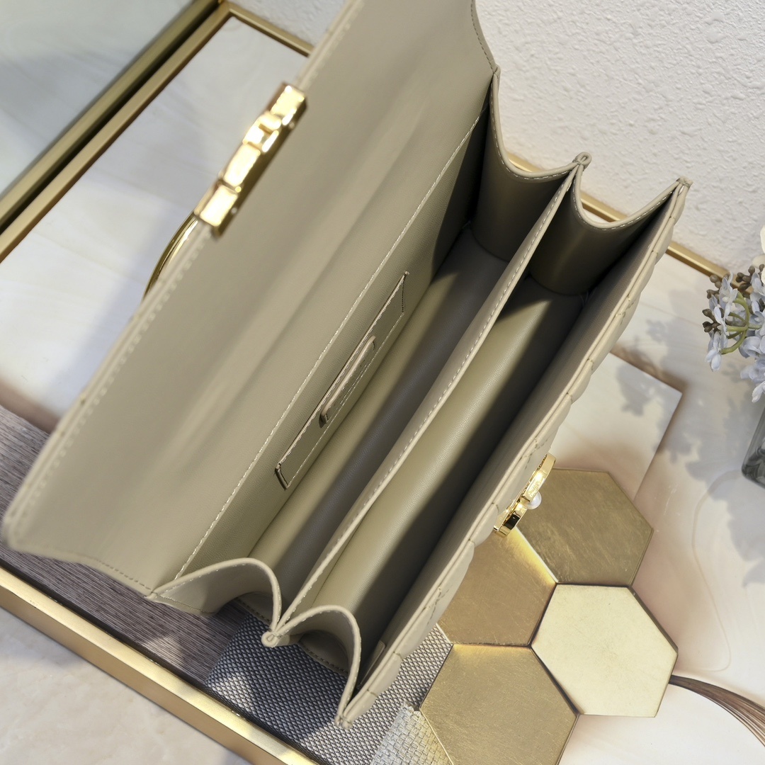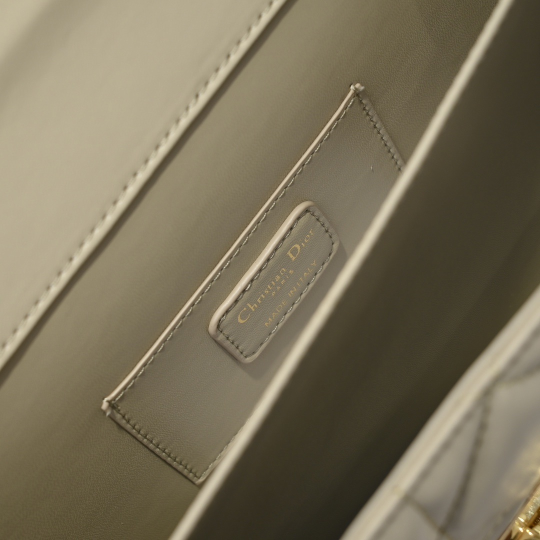 本体にはアイボリーカラーの厳選カーフレザー(牛皮)を採用。子牛革特有の滑らかな手触りと自然な光沢が「落ち着いた高級感」を醸し出し、経年変化でレザーの風合いが深まり「育てる楽しみ」を提供。表面には特大カンバセラージュステッチ(超大藤格纹缉面线)を施し、ディオールの象徴的な藤格紋を通常より大きくデザイン。深く刻まれたステッチが立体的な陰影を生み出し、光の当たり方で「浮かび上がるような表情」を演出します。