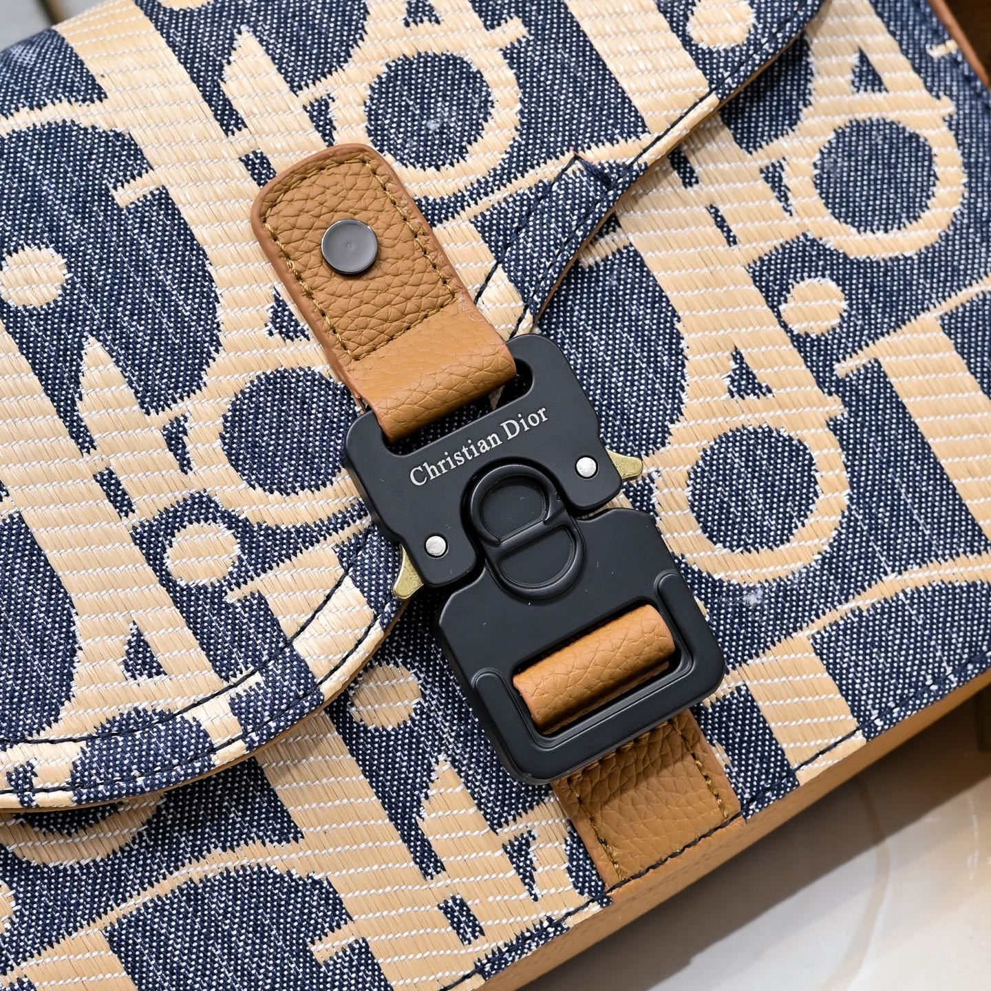 フラップ正面には金属コーティングを施した真鍮製「DIOR」ロゴを配しました。シャープな彫刻と控えめな光沢が、ブラックグレインレザーの地味さに「力強いアクセント」を添え、「さりげないブランドアピール」を実現。ロゴのサイズは「主張しすぎない」よう計算され、全体のバランスを損なわず「品格を高める」役割を果たします。