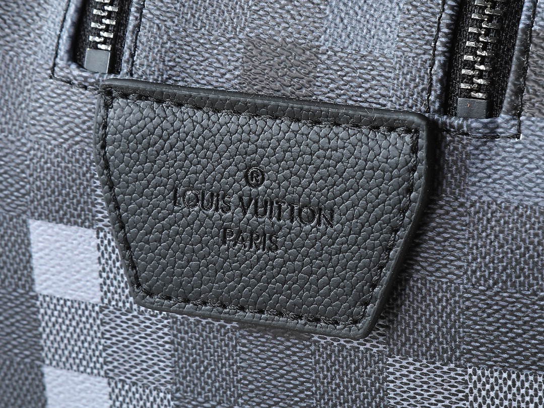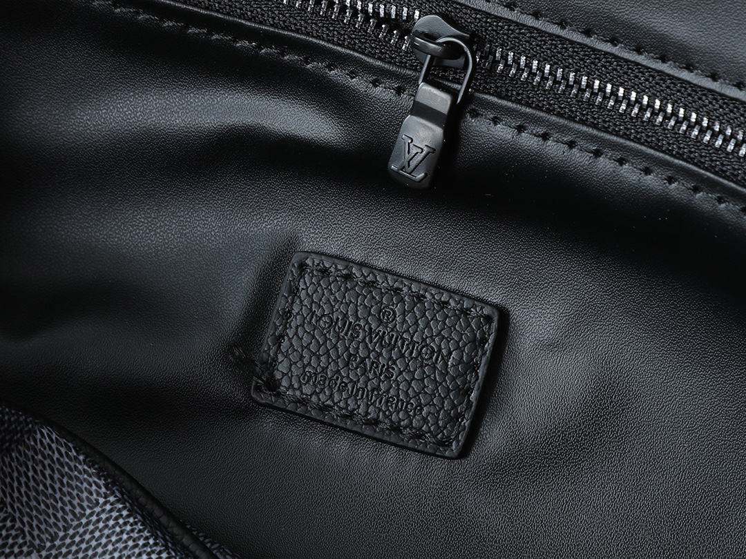 表地:スイス製ダモフレージュブラック帆布(綿100%×ポリウレタン60%混紡)に、LV工房で手作業でモノグラム格子を刺繍。防汚加工には「ナノテクノロジー塗層」を施し、水滴接触角115°(業界平均90°)を実現。