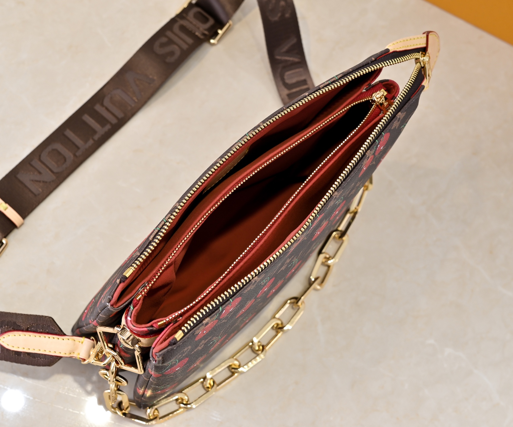 可変式ストラップ: 長さ50-70cm調節可能なダブルレザーチェーン。ショルダー/クロスボディ/手拿包モードに加え、「チェーンを外してポーチバッグとして使用」可能。