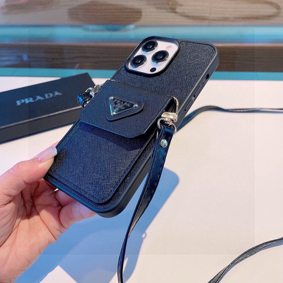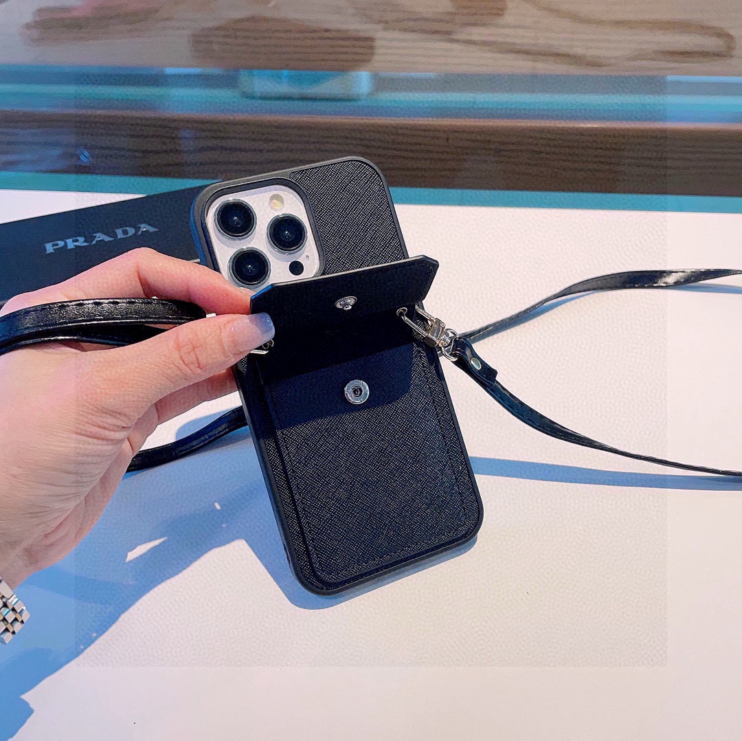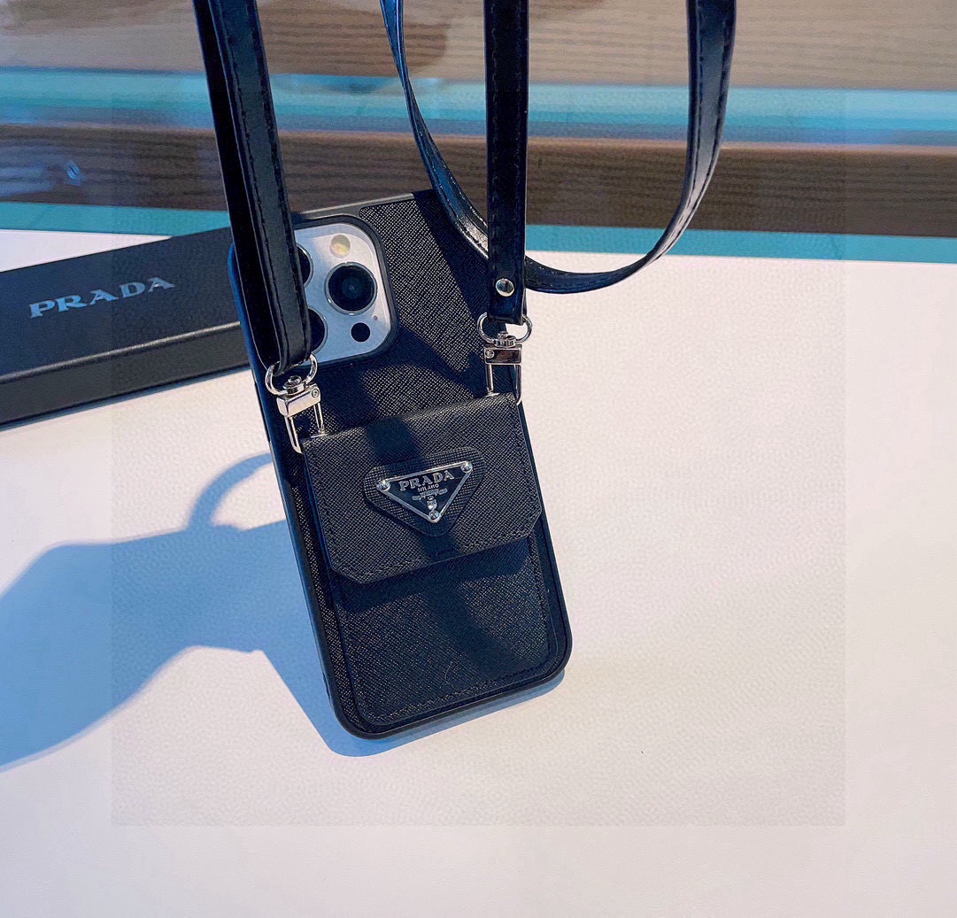 【Pradaデザイン】斜め掛けカードホルダー付き全包素材スマホケース(iPhone 16シリーズ対応)