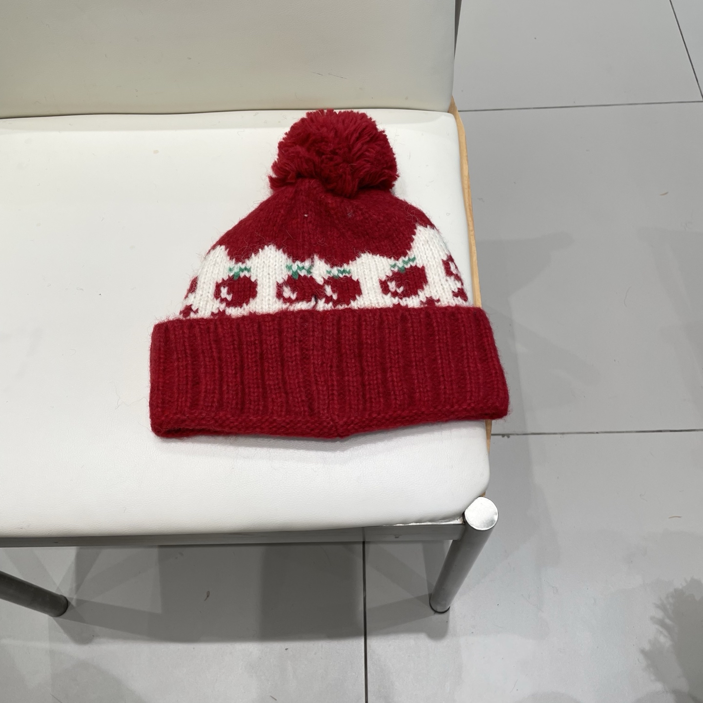 チェリーボール刺繍:帽頂に立体感のある赤いチェリーボール刺繍を配置、冬の季節感を演出。