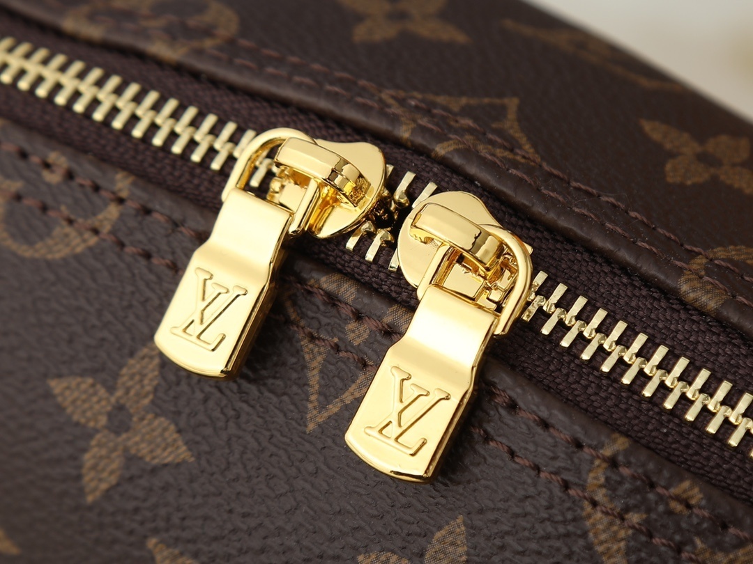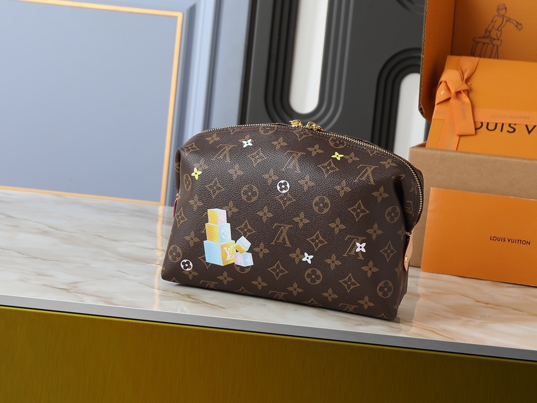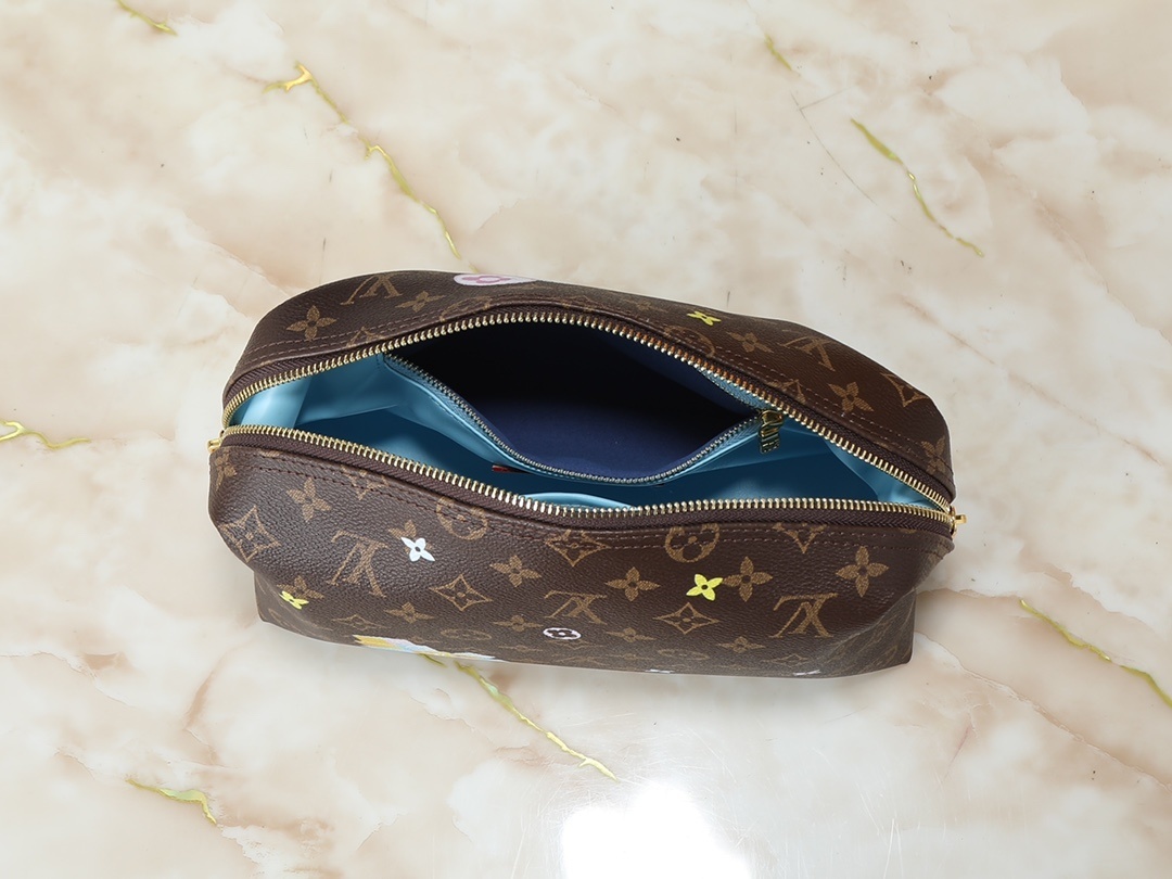 ルイ・ヴィトンと村上隆のコラボレーション20周年を記念した限定シリーズの最新作。本作は伝統的なモノグラム帆布に村上隆のカラフルなアートワークを融合させ、27.0×18.0×9.0cm(長×高×幅)のコンパクトサイズながら、前衛的なデザインと実用性を両立させたメイクアップバッグです。