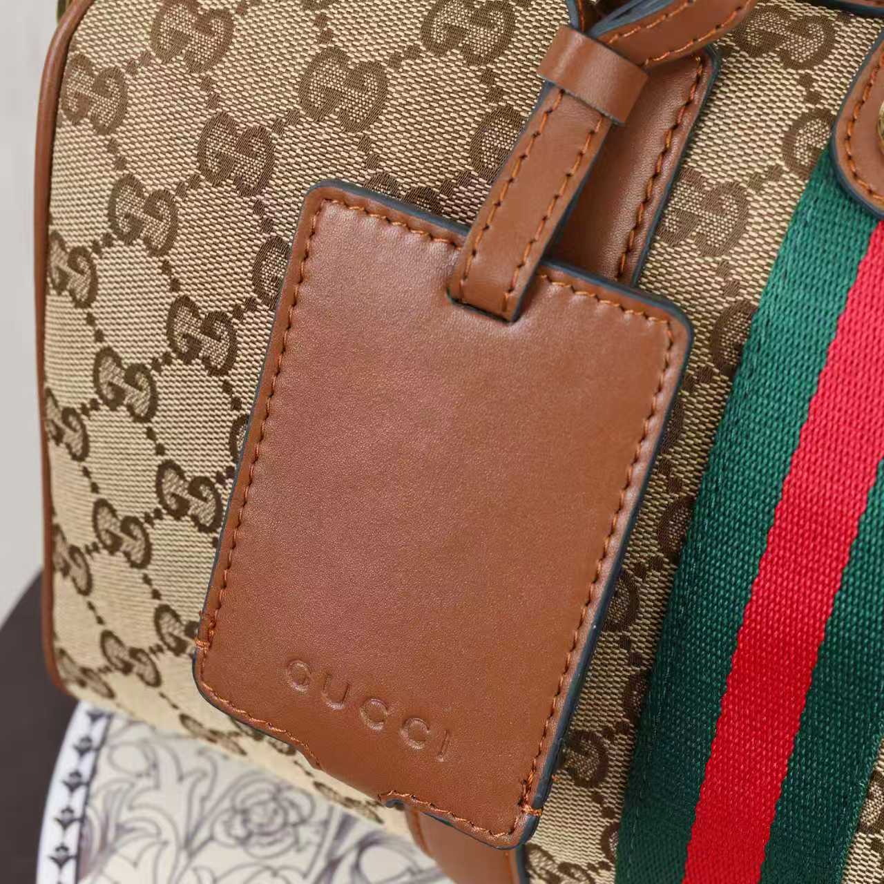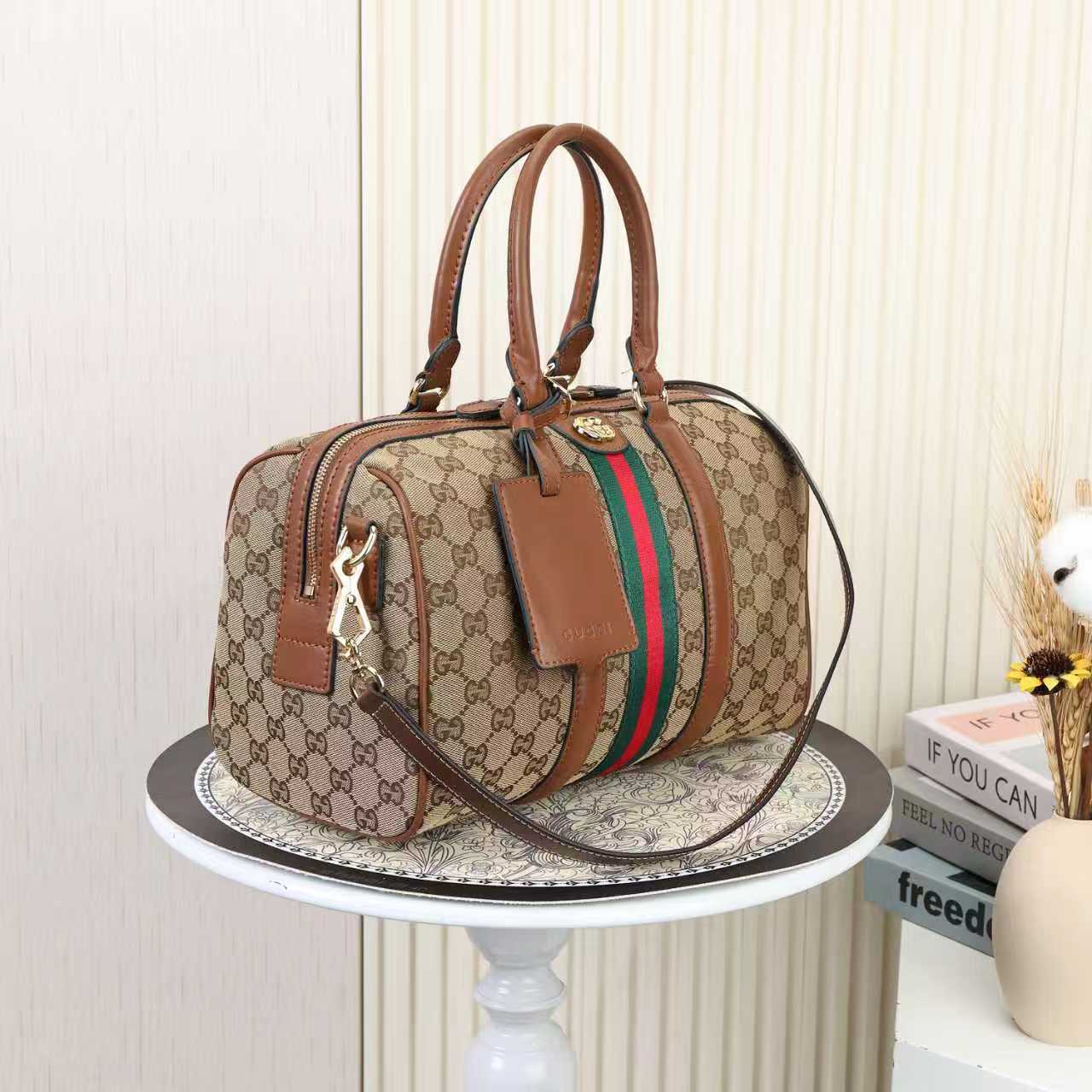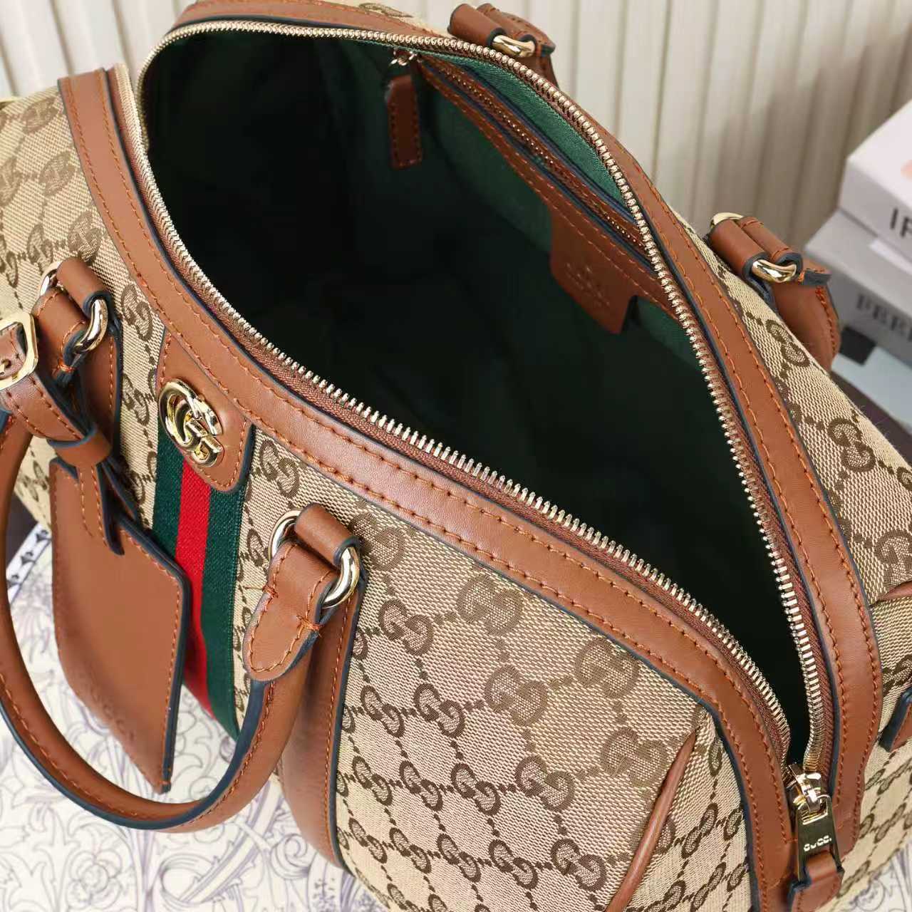 デザイン:ボストンバッグ / GGキャンバス(アーモンド/ブラウン) / ブラウンレザー滚辺 / 金調ダブルGロゴ(提手・金具) / グリーンリネンコットン裏地 / 双G提手(高さ10cm) / 可拆卸可調節レザー肩带(長さ48cm/調節可能) / ジッパー開閉 / 内側ポケット(オープン×1・ジッパー×1)