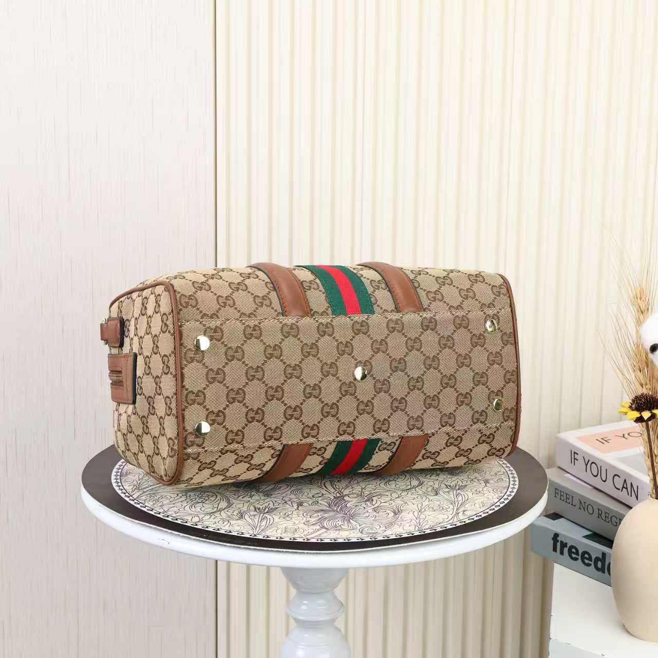 グッチ Ophidia シリーズ ボストンバッグ|GGキャンバス×金調双Gロゴ|クラシック配色(アーモンドキャンバス/ブラウン)で叶える旅と日常の実用美