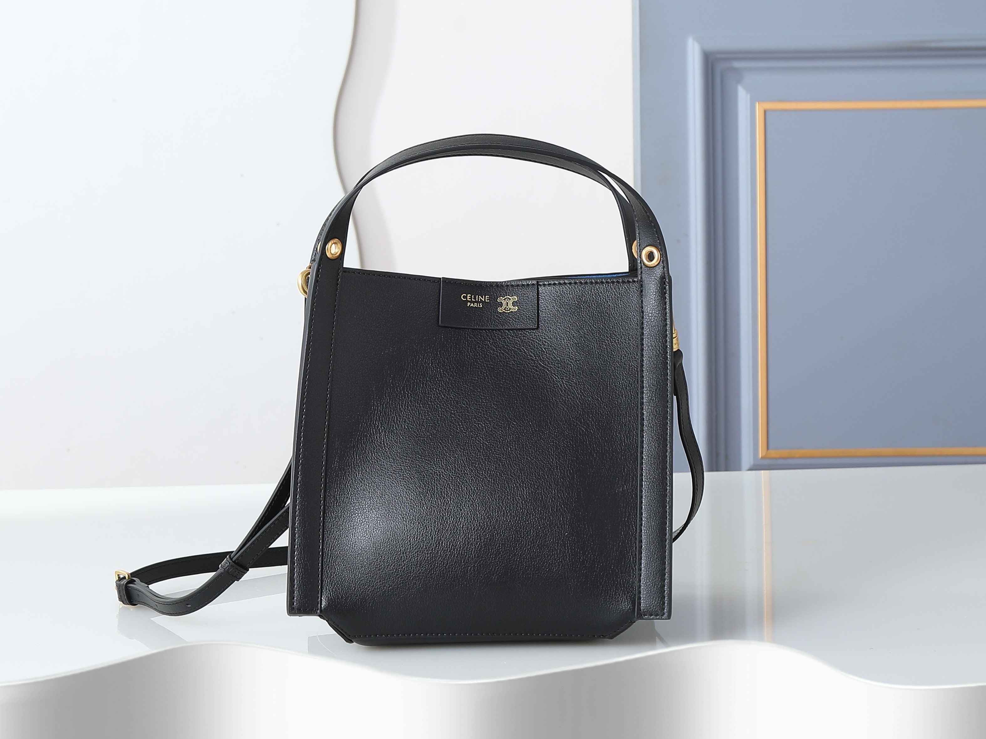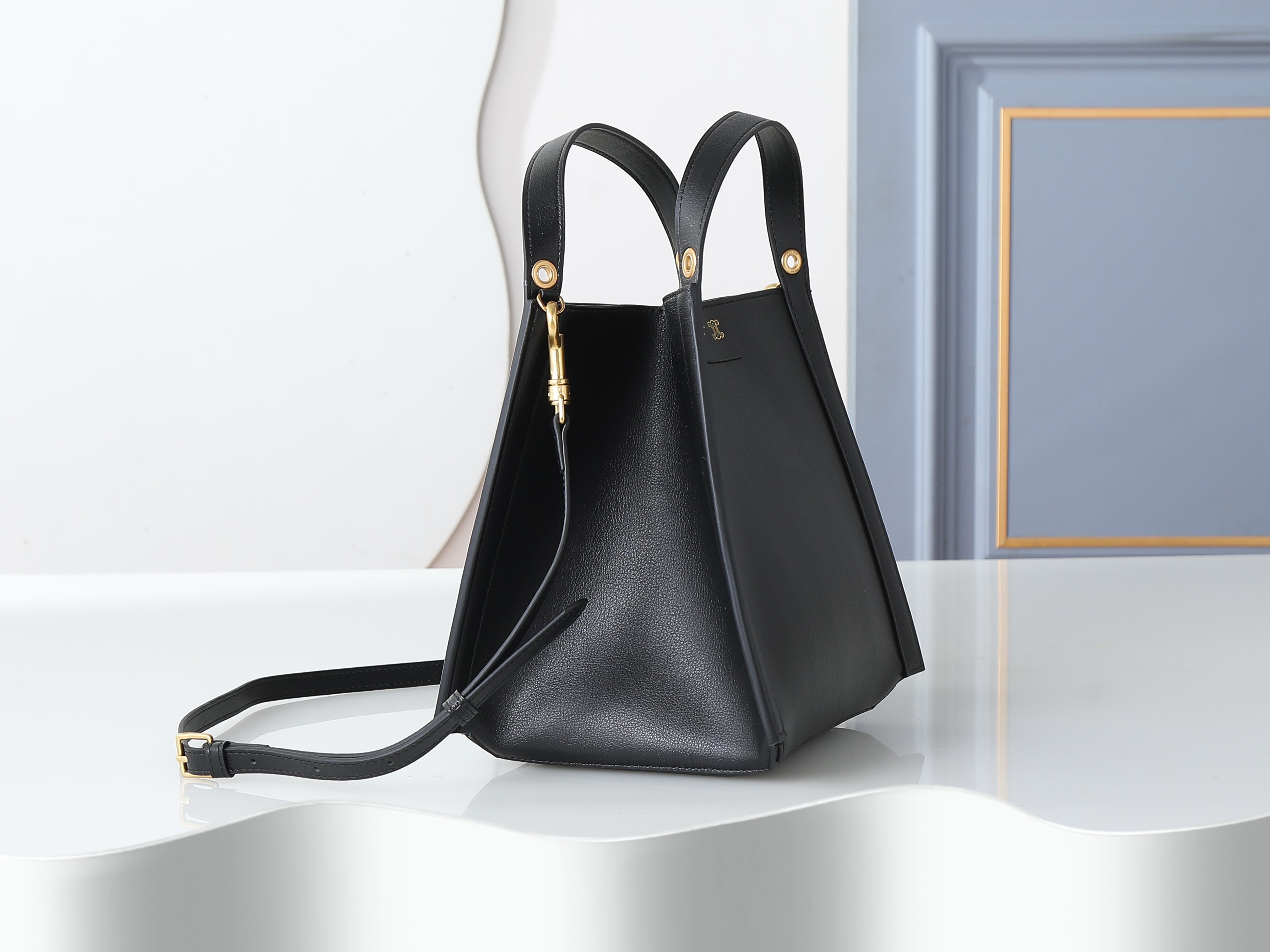 セリーヌ CUBO スモールハンドバッグ|ブラック牛革|ゴールドトーン仕上げ|3WAY背法(手提ち/肩背/クロスボディ)|取り外し調節可能ショルダーストラップ|サイズ18.5×21×17cm