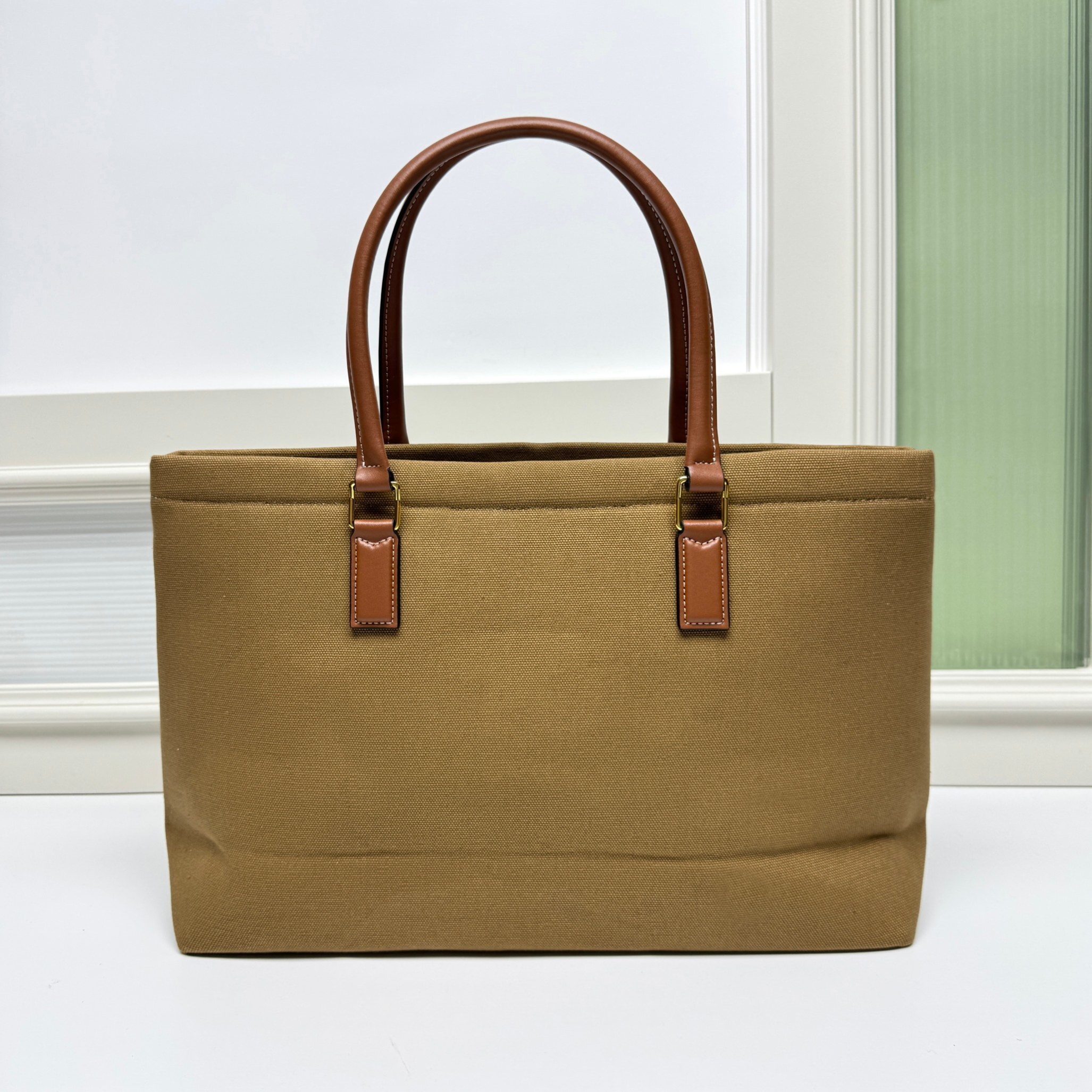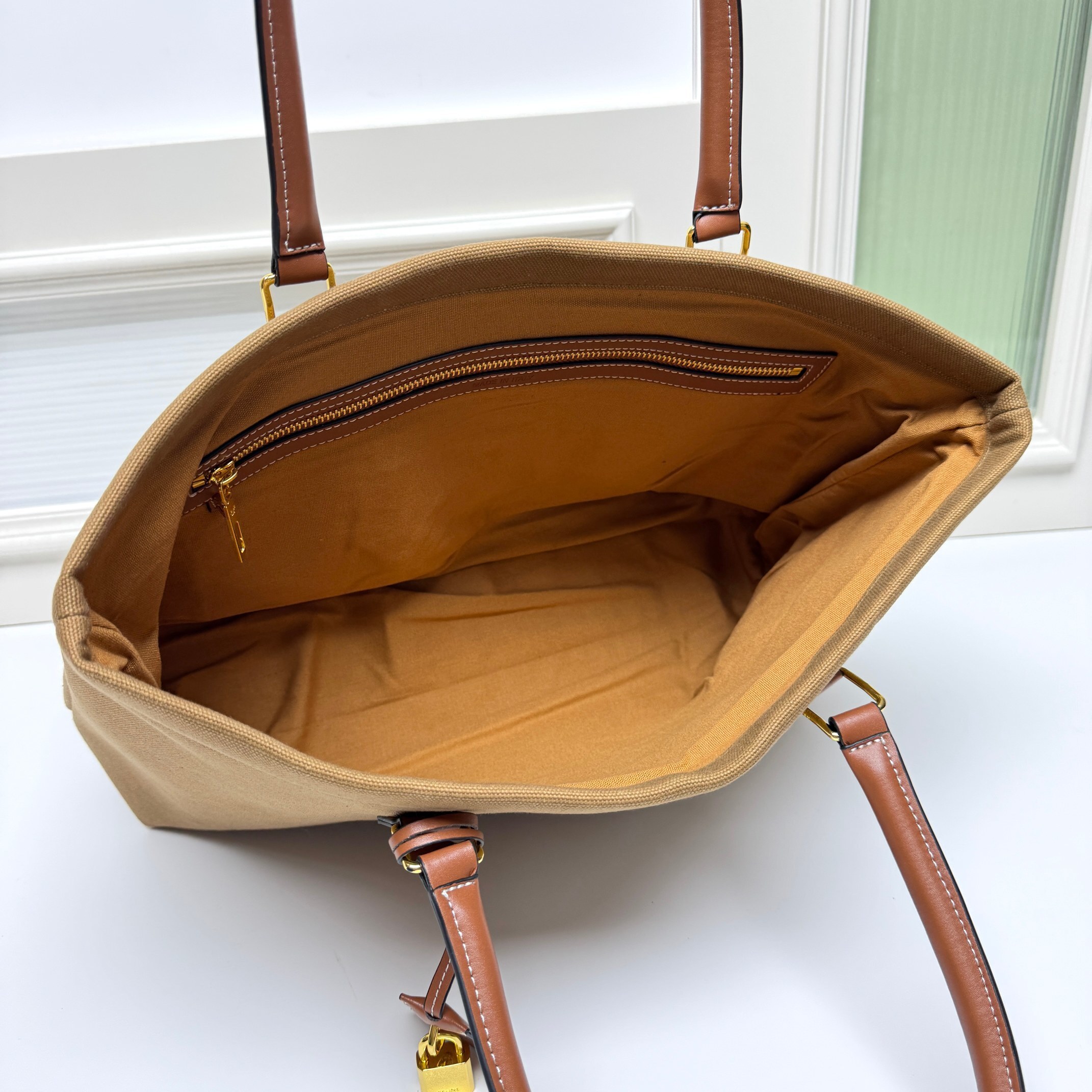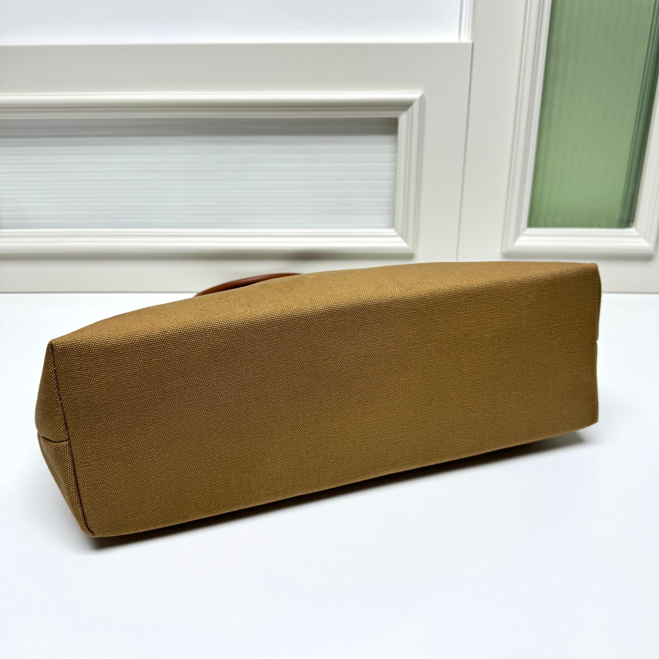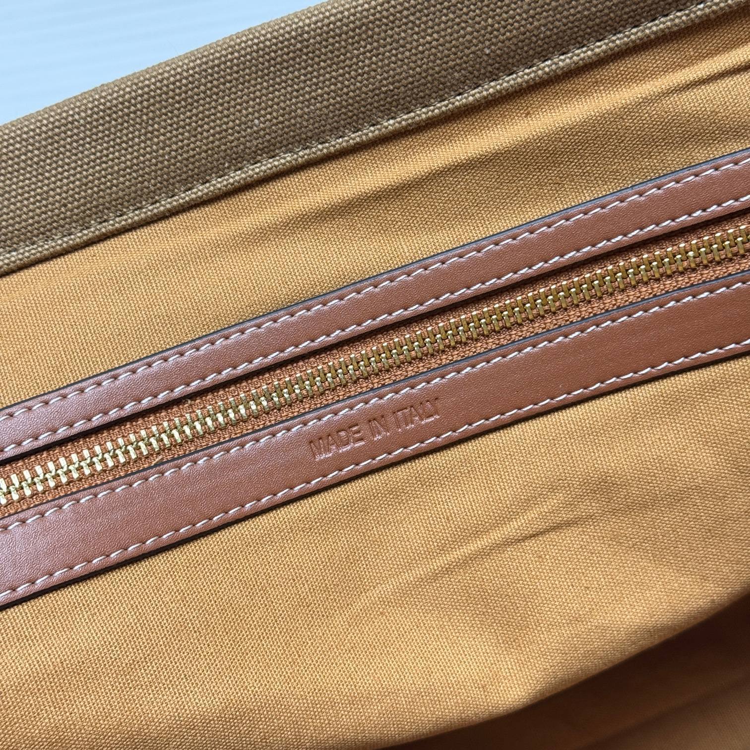 ・小牛革のアクセント:開口部と持ち手に配された同系色小牛革トリムが「キャンバスのカジュアルさを中和」。表面の微細な自然シワが「使い込むほどに深まる味わい」を予感させる(「職人技の証」)。