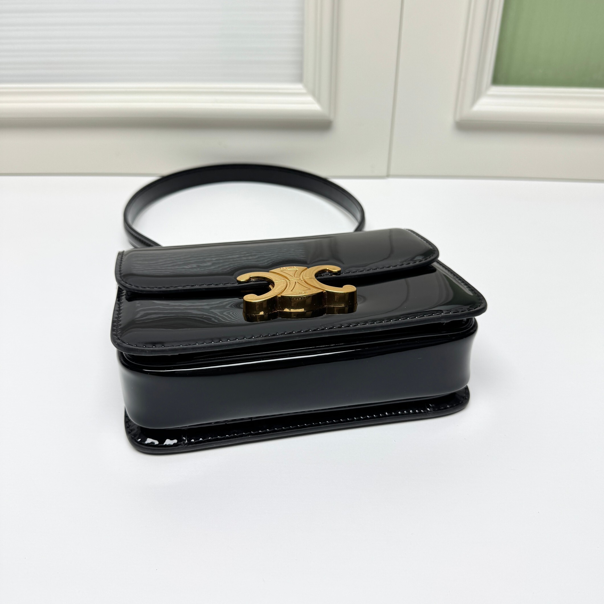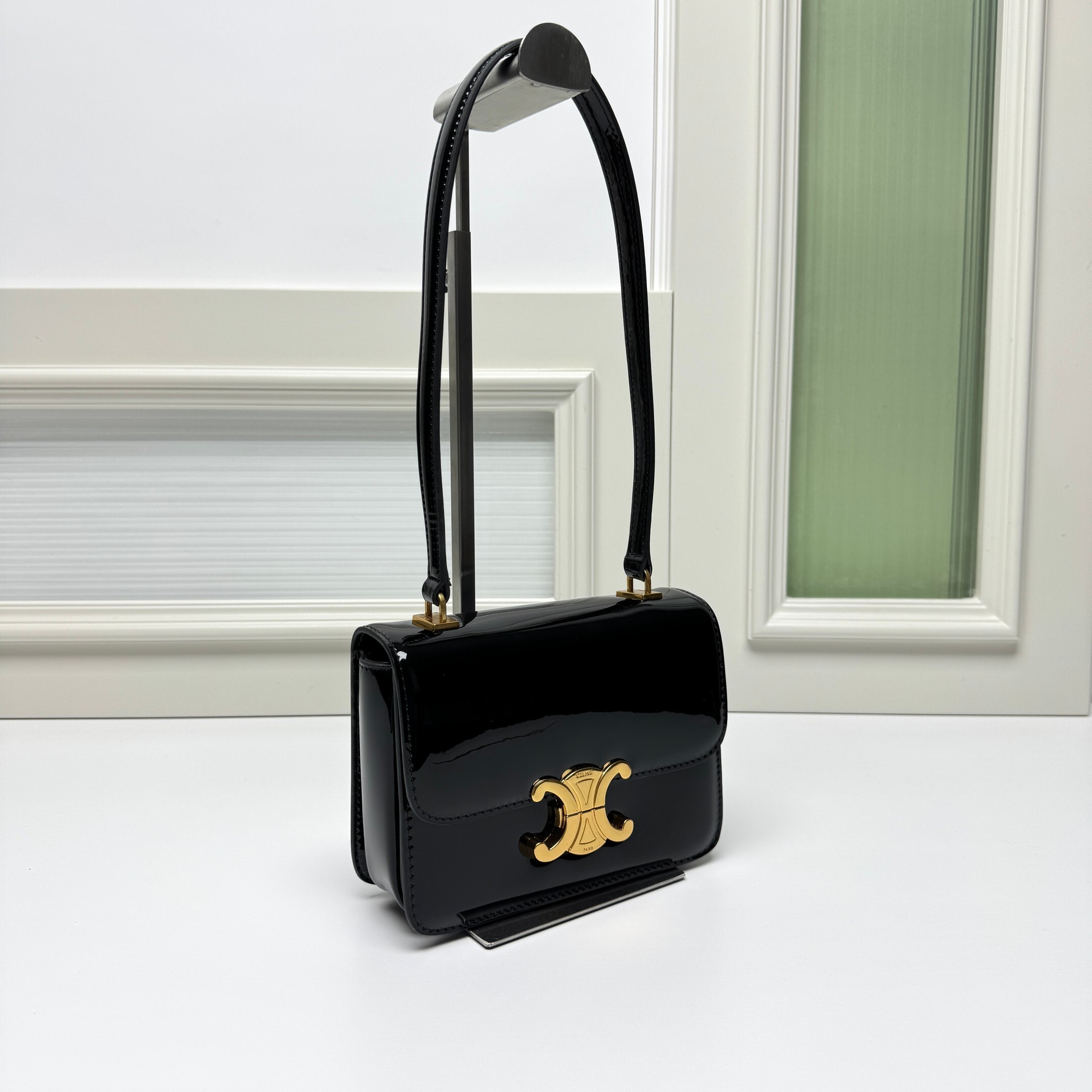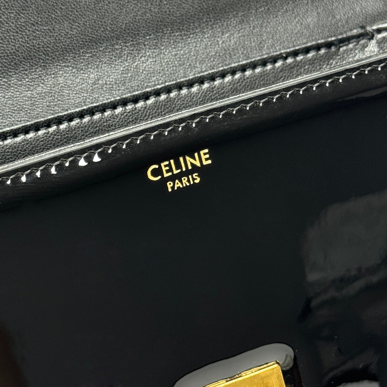 デザイン:ミニハンドバッグ / 漆皮牛革(ラッカー加工牛革・フランス産) / 長肩帯(牛革製・長さ調節可能・約50-60cm) / 腋下背/肩背2WAY / マグネット式フラップ留め具(CELINEロゴプレート付き) / 薄型デザイン(奥行7cm) / ゴールドトーンメタル金具(リング・ロゴプレート)