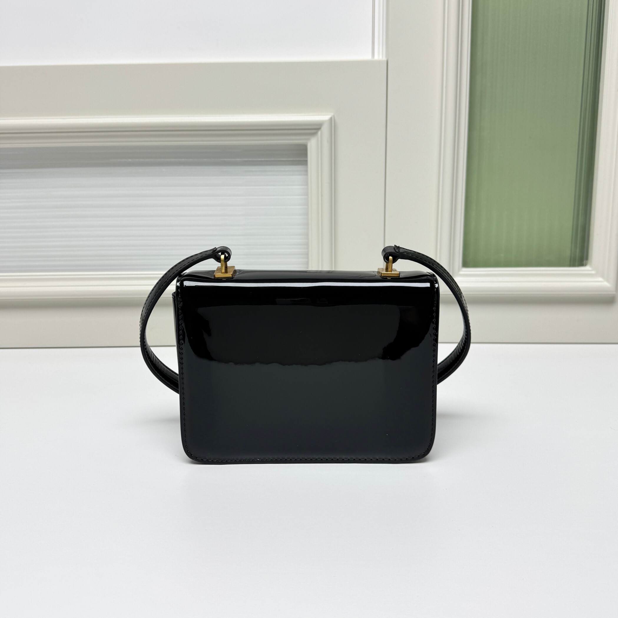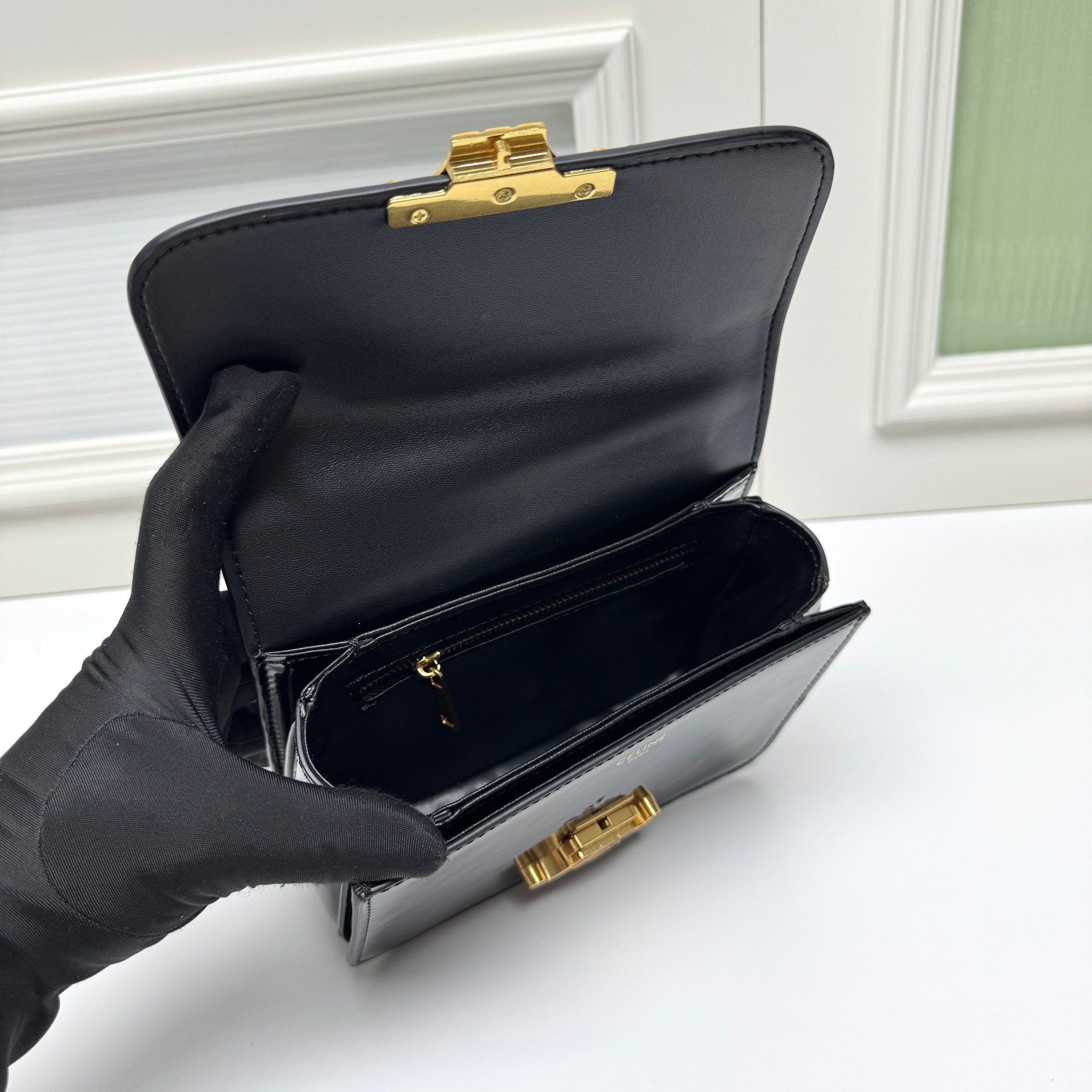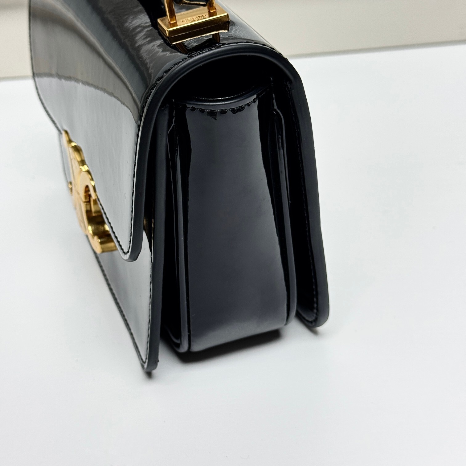 デザイン:ミニハンドバッグ / 漆皮牛革(ラッカー加工牛革・フランス産) / 長肩帯(牛革製・長さ調節可能・約50-60cm) / 腋下背/肩背2WAY / マグネット式フラップ留め具(CELINEロゴプレート付き) / 薄型デザイン(奥行7cm) / ゴールドトーンメタル金具(リング・ロゴプレート)