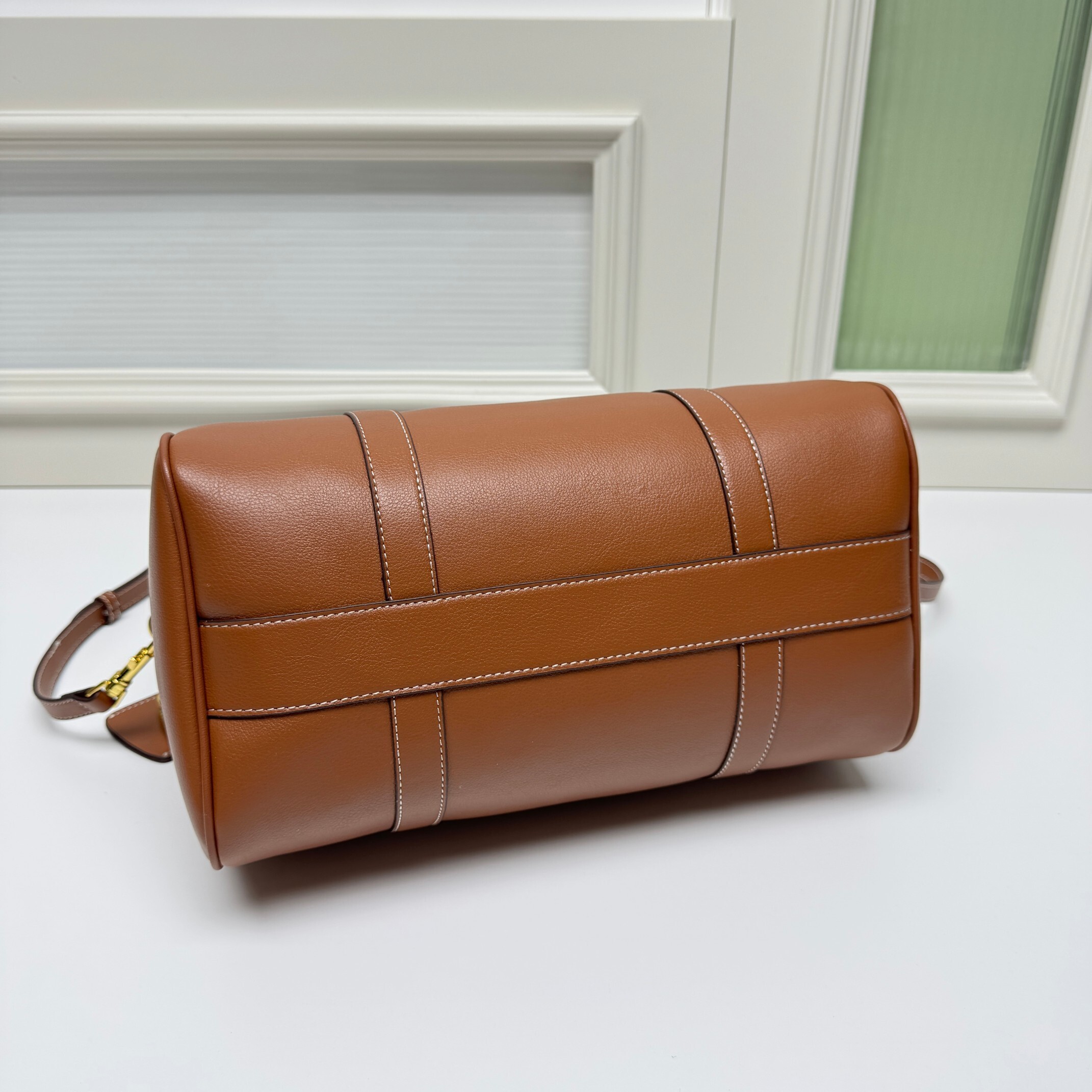 手提ち:短い牛革トップハンドル(長さ約20cm)が「空港やホテルでの優雅さ」を演出(手のひらにフィットする太さ:約2cm)。