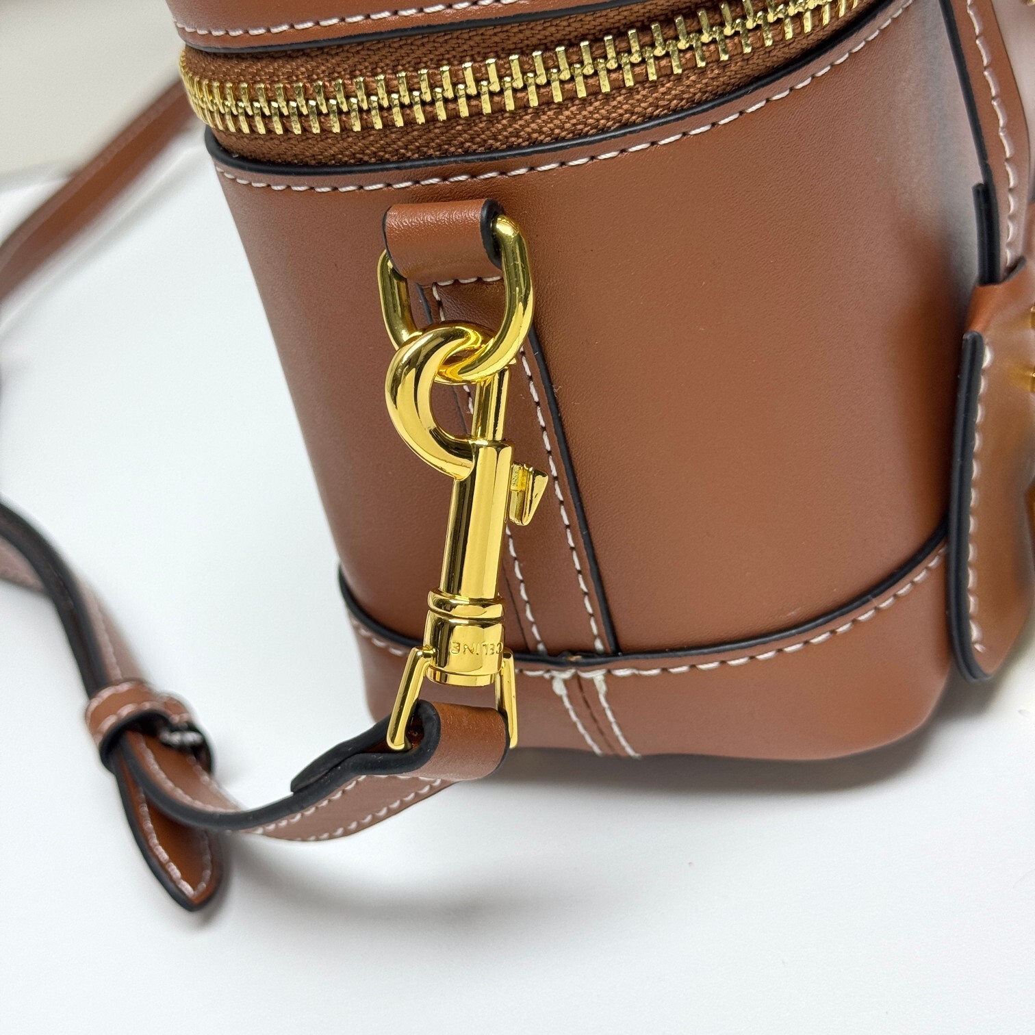 ・天然牛革(ベビーカーフ)の芸術:本体全面に使用したフランス産天然牛革(ベビーカーフ)は、セリーヌ工房が「最も尊貴な原版皮」と位置づける素材。表面の微細な粒面が「指先で感じるしっとりとした肉厚感」を演出し、「使い込むほどに深まる自然なシワ」が「レトロな味わい」を予感させる。「質感が結実し、精巧な構造を形成する」特性を活かし、「型崩れしにくい立体感」を実現(「可塑造精巧鮮明结构」の所以)。