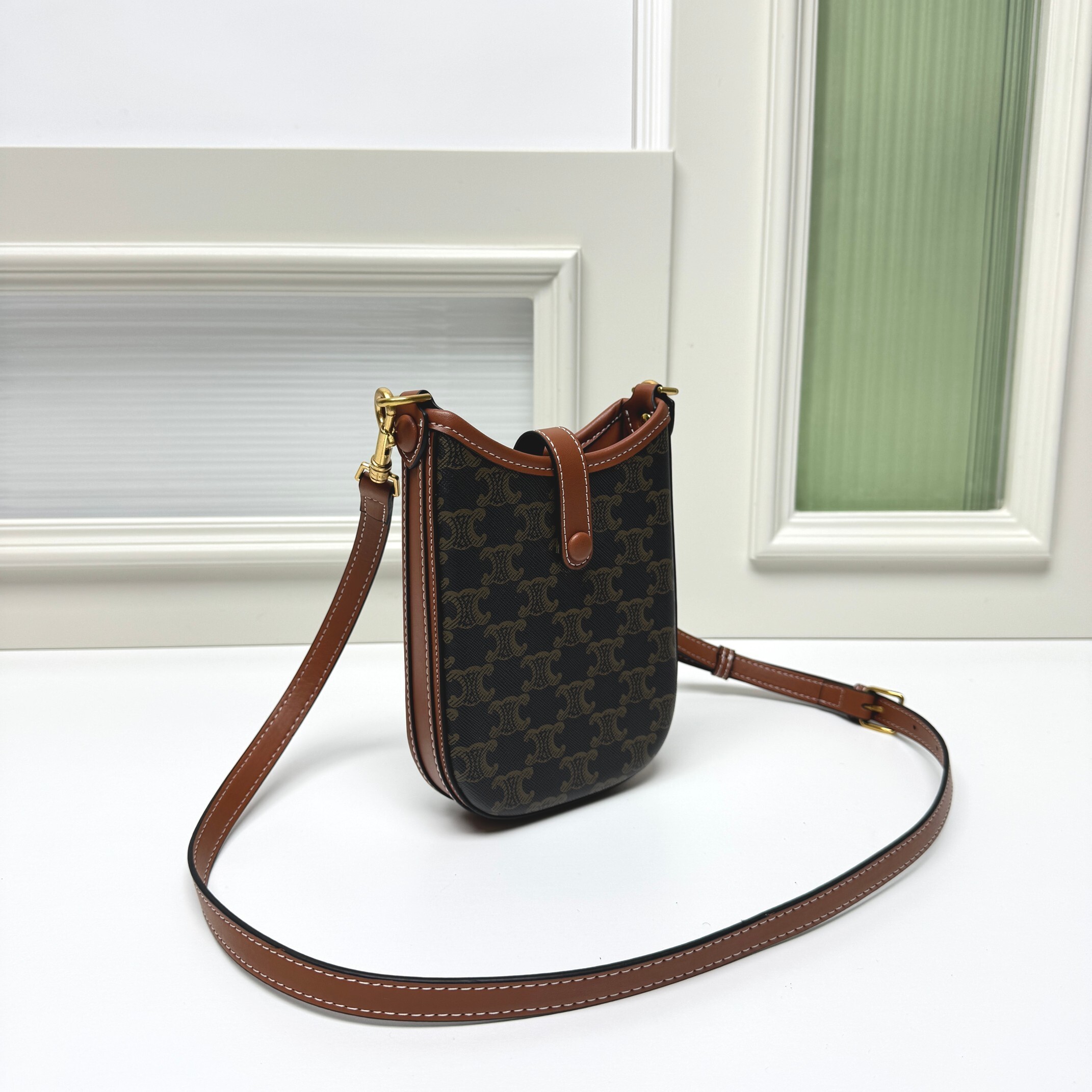 デザイン:スマホポーチ / 牛革(フランス産・挺括加工) / ミニマルフォルム(CELINEロゴ刻印) / 調節可能ショルダーストラップ(牛革製・80-110cm) / マグネット式フラップ留め具 / 薄型補強板(自立可能) / 内側メインコンパートメント(オープン)