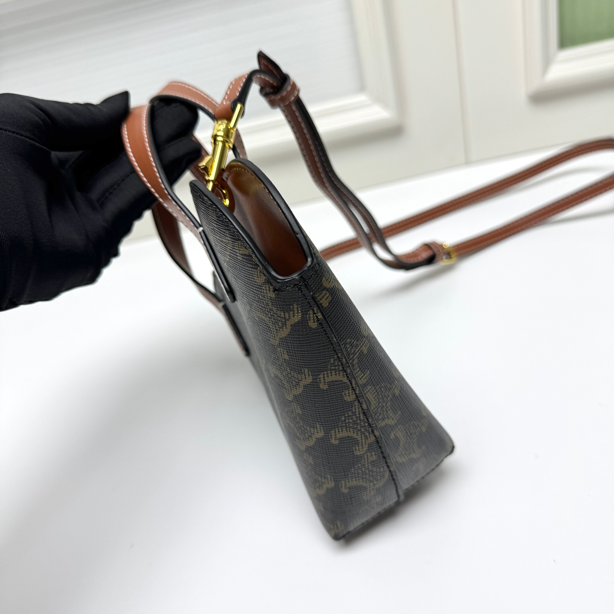 手提ち:短い牛革トップハンドル(長さ約15cm)が「カフェやデートでの優雅さ」を演出(手のひらにフィットする太さ:約1cm)。