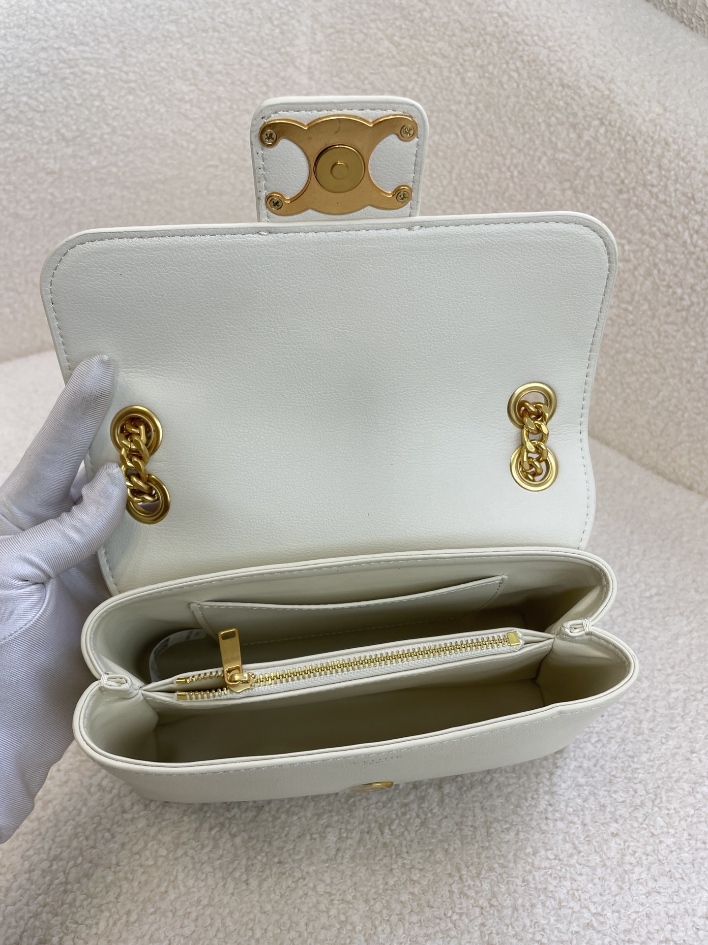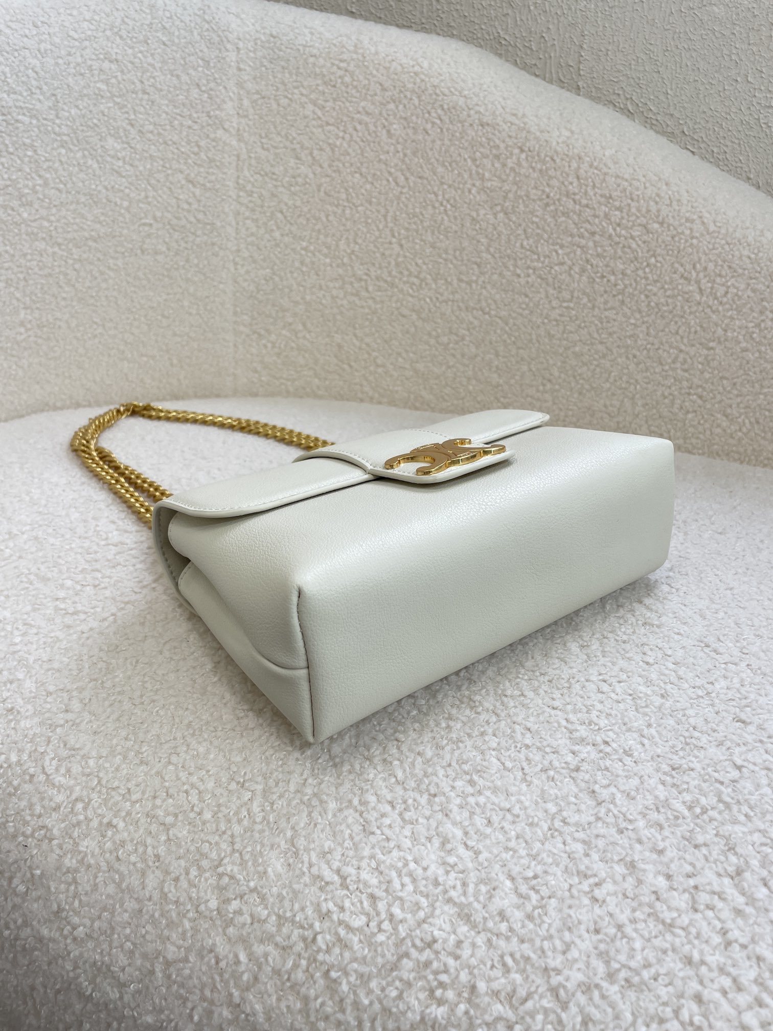 ・金属TRIOMPHEロックの象徴性:正面中央に配されたゴールドトーン金属製TRIOMPHEロック(凱旋門モチーフ)が「一目で識別できるブランドアイデンティティ」を確立。ロックの「立体的な彫刻感」が「精巧な包身にアクセント」を添え、「セリーヌの正統性」を担保(「标志性金属TRIOMPHE锁扣 点缀精巧包身」の所以)。