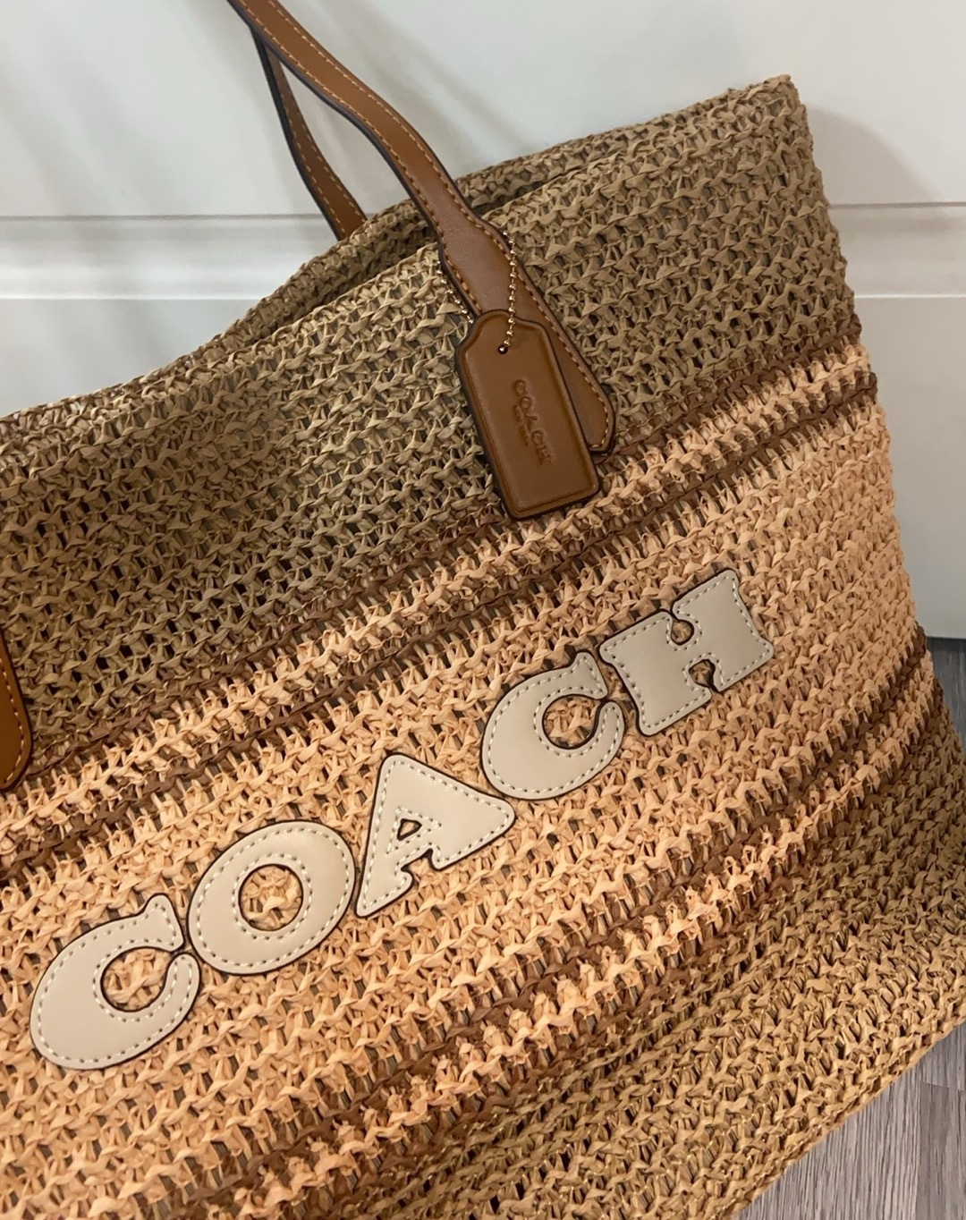 ・ ロゴの控えめなアクセント:前面中央に配されたコーチC字ロゴ(エンボス加工)は、「牛革パーツに刻印」で「ラフィア草の主張を和らげ、上品なブランドアイデンティティ」を確立。