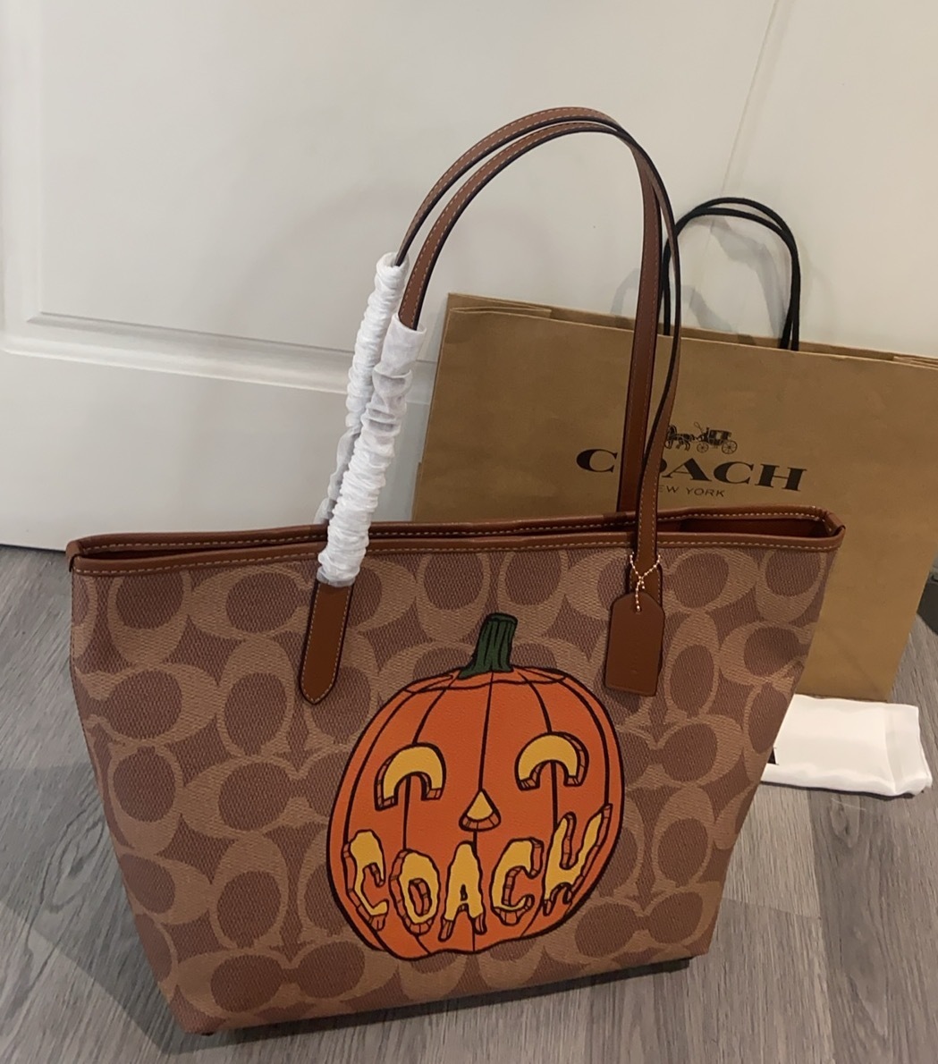 コーチ ハロウィン限定 33プリントトートバッグ CCE70|2デザイン・鬼面×南瓜プリント|ブラック×ツイード・33×16×29cm・大容量|不気味だけど愛らしい・節日の雰囲気満載
