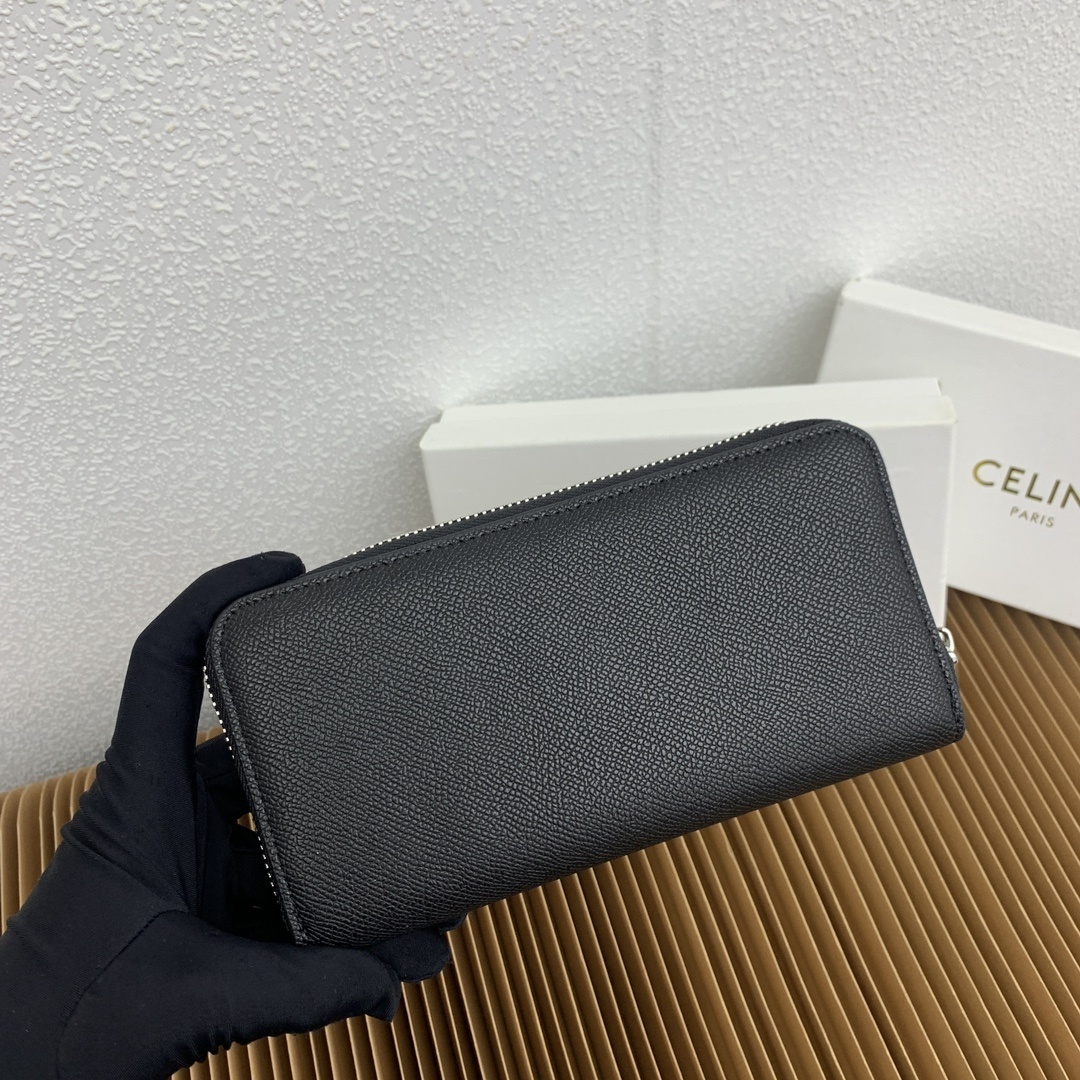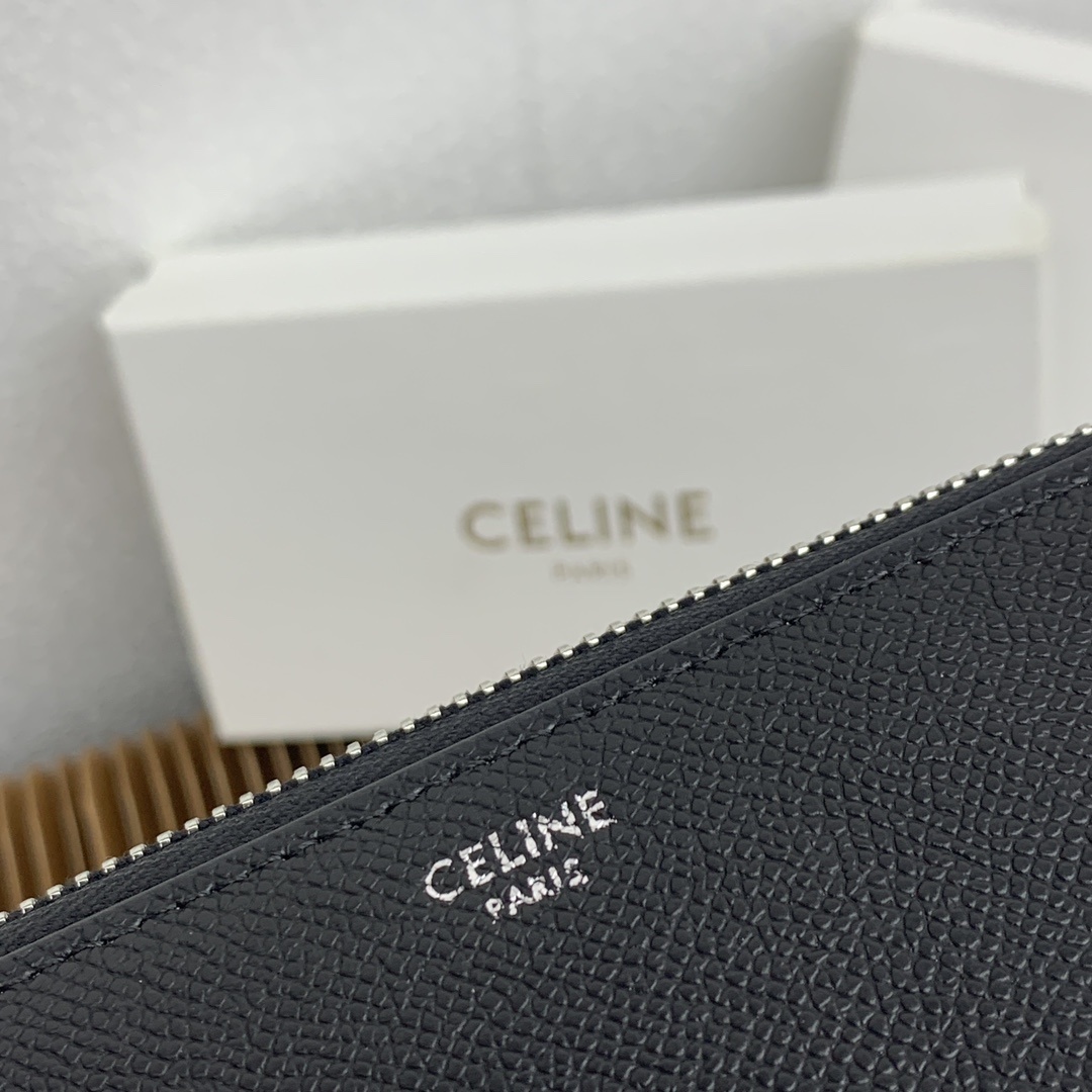 CELINE ピケカーフスキン ラージジッパーウォレット|ダークブラック カーフスキン内張り×シルバーメタル 8カードスロット&多機能収納(19×10cm)
