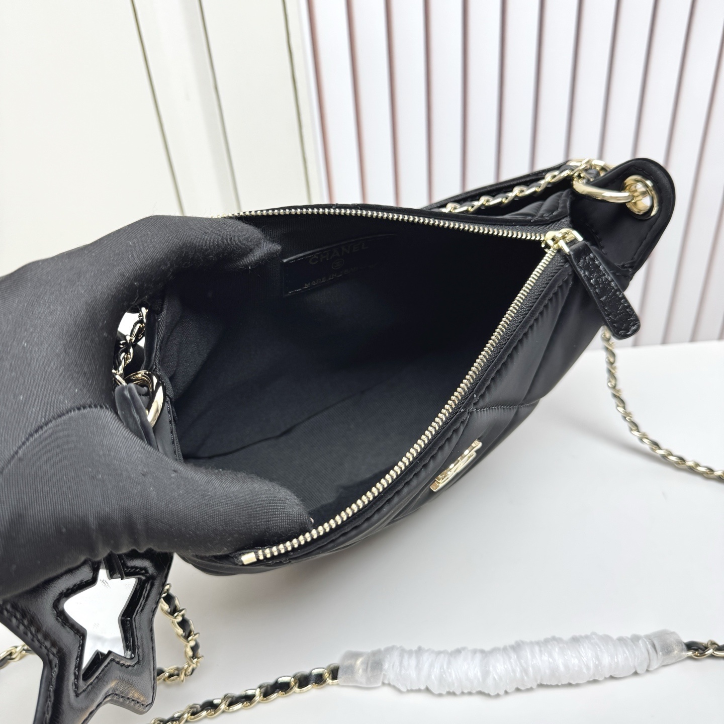 バッグの最大の特徴は、星形のレザー掛け件です。表面にはシャネルの象徴である「ダブルC」ロゴが刺繍されており、アクセントとして目を引きます。裏面には小型ミラーが付いているため、外出先でのメイクチェックにも便利です。