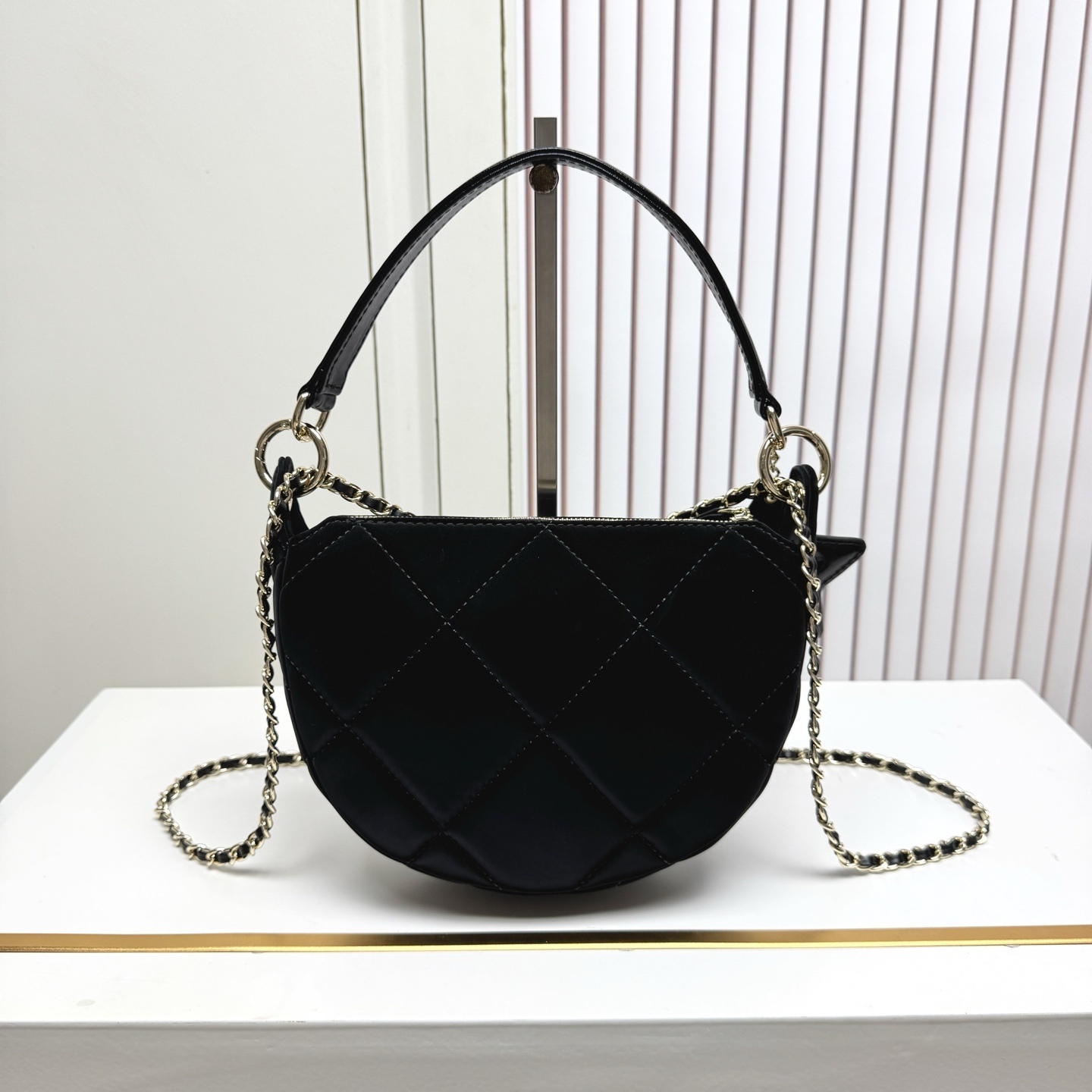 ハンドル部分はレザー巻きメタルチェーンで、長さを調整することでショルダーバッグやクロスボディバッグに変身。短いストラップを使えば手提げにもでき、シーンに合わせたスタイルを楽しめます。