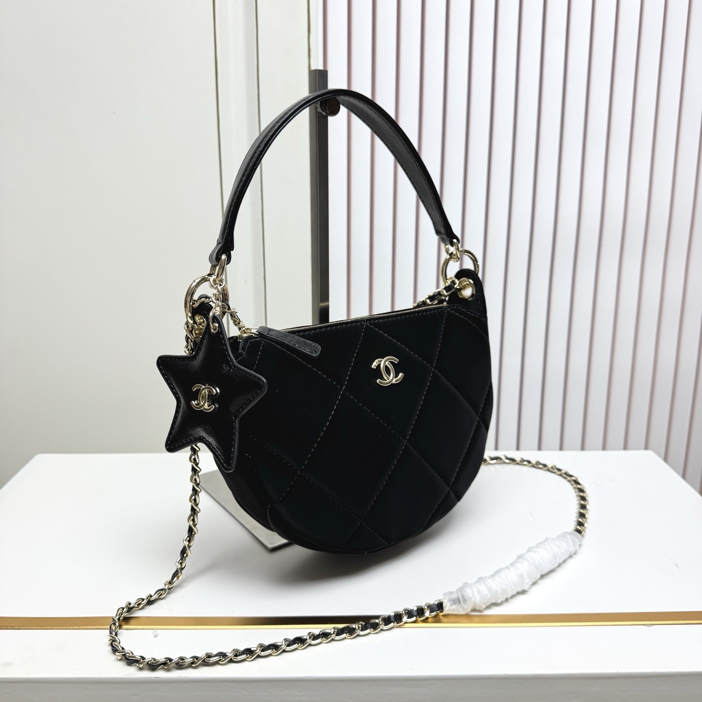 このクレセントバッグは、秋冬の様々なコーディネートにマッチします。厚手のニットやコートと組み合わせれば、暖かみのある雰囲気を演出;レザーのジャケットやスキーウェアと合わせれば、アクティブなスタイルにも対応。星形の掛け件やダブルCロゴが、シンプルなコーデにアクセントを加え、冬のファッションをより華やかにしてくれます。