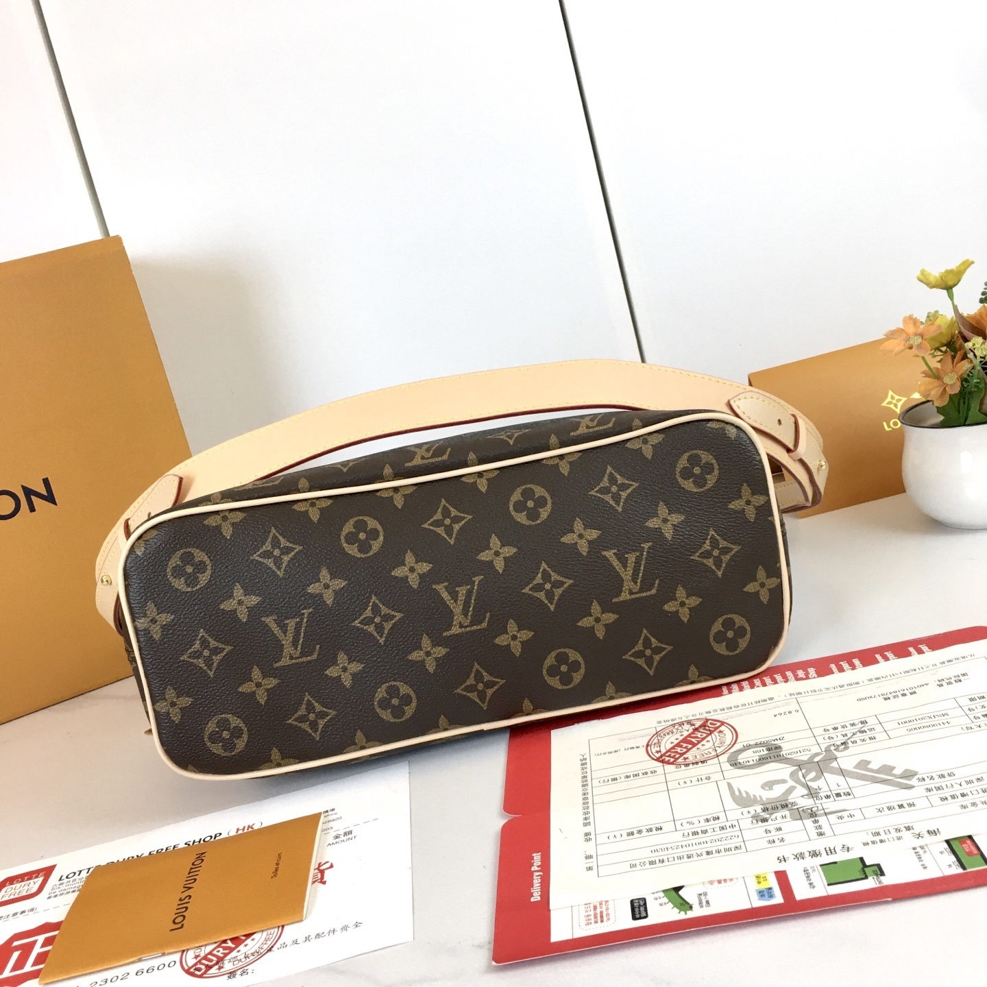LVの象徴であるモノグラムを、耐久性の高いポリエステルコーティング帆布に再現。アーチ型のトップエッジと楕円形の飾り縁(エンドキャップ)が、原版の優雅なシルエットを忠実に再現。