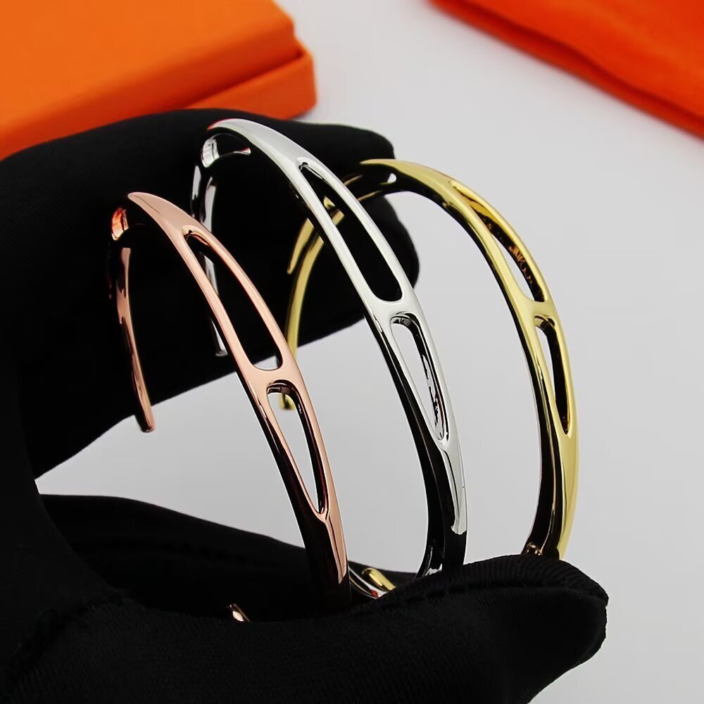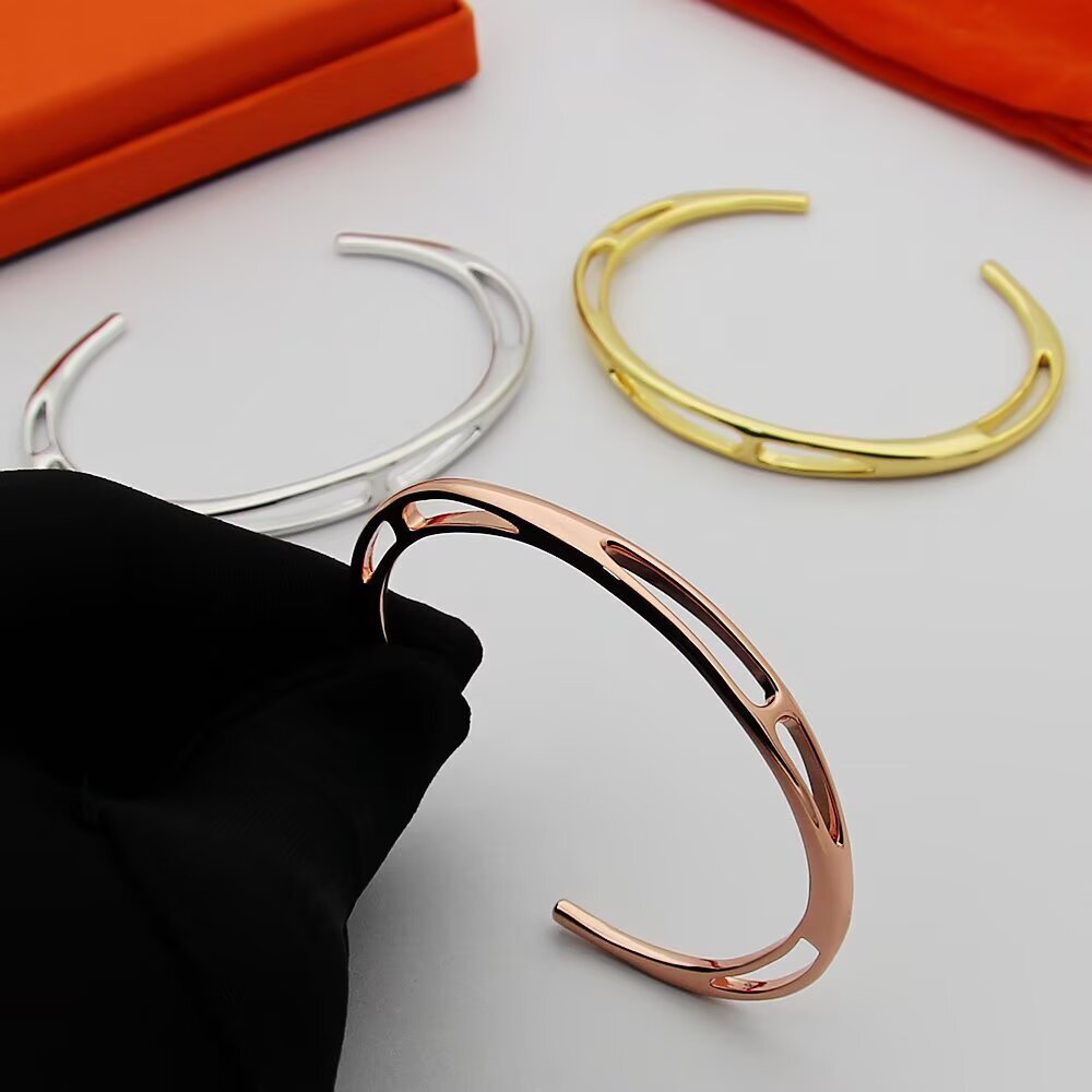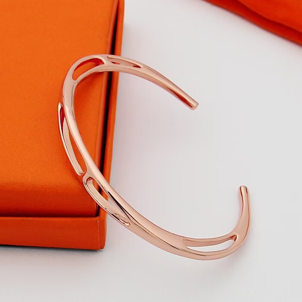 エルメスの象徴ともいえる「Hモチーフ」をあしらった、クラシックなブレスレットです。通称「ピッグノーズ(豚鼻)」と呼ばれる愛らしいシルエットが、手元にほんのりと高級感を添えます。どんな装いにも馴染みやすく、長く愛される普遍的なデザインに仕上げました。