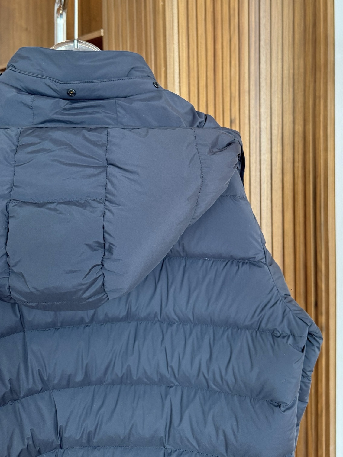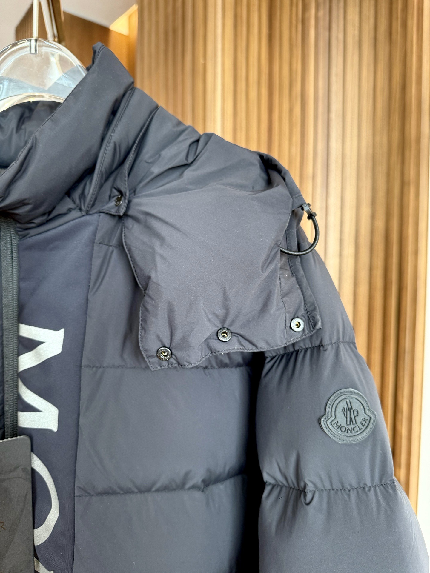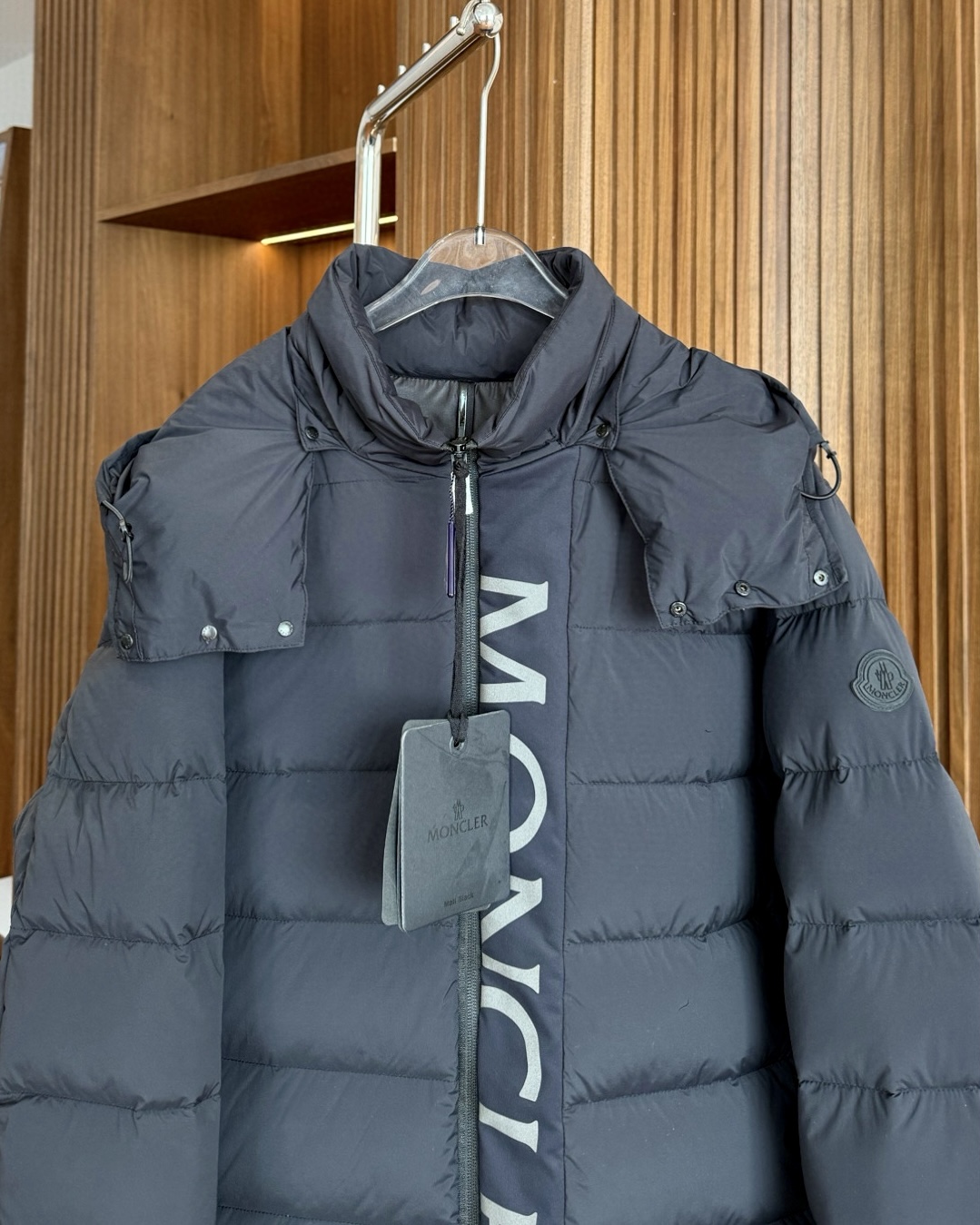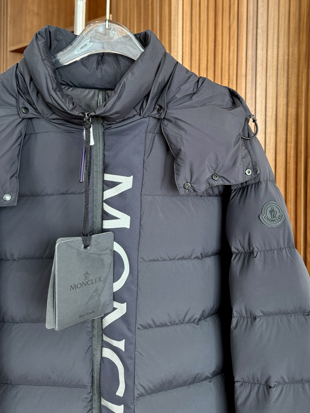 ドア部分のモンクレールロゴには3M高反射ブラック素材を採用。光の加減で深みのある輝きを放ち、全体の「闇の美学」を強調。マットな外側と光沢のあるライナーの2層構造で、一着で2つの表情を演出。