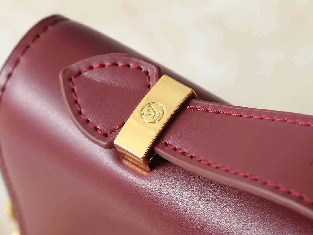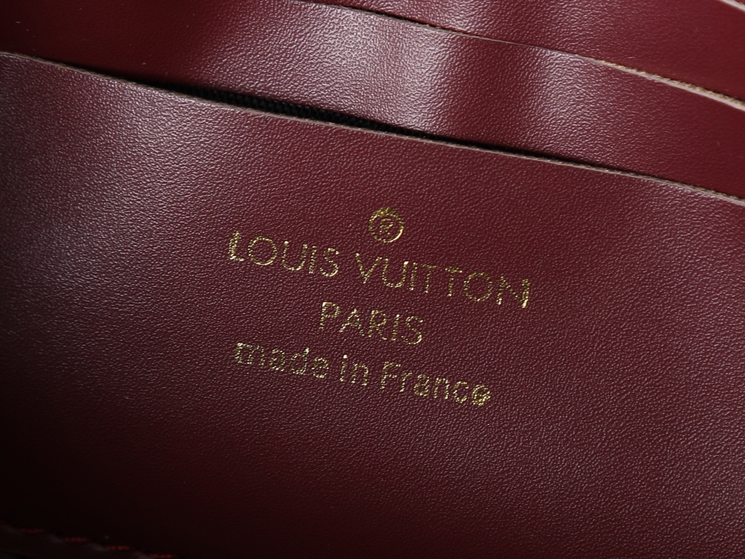 柔らかな光沢のあるカーフレザー:イタリア産プレミアムカーフレザーを使用し、触感の柔らかさと耐久性を両立。表面には「LVモノグラム」の立体彫刻加工を施し、高級感を強調。