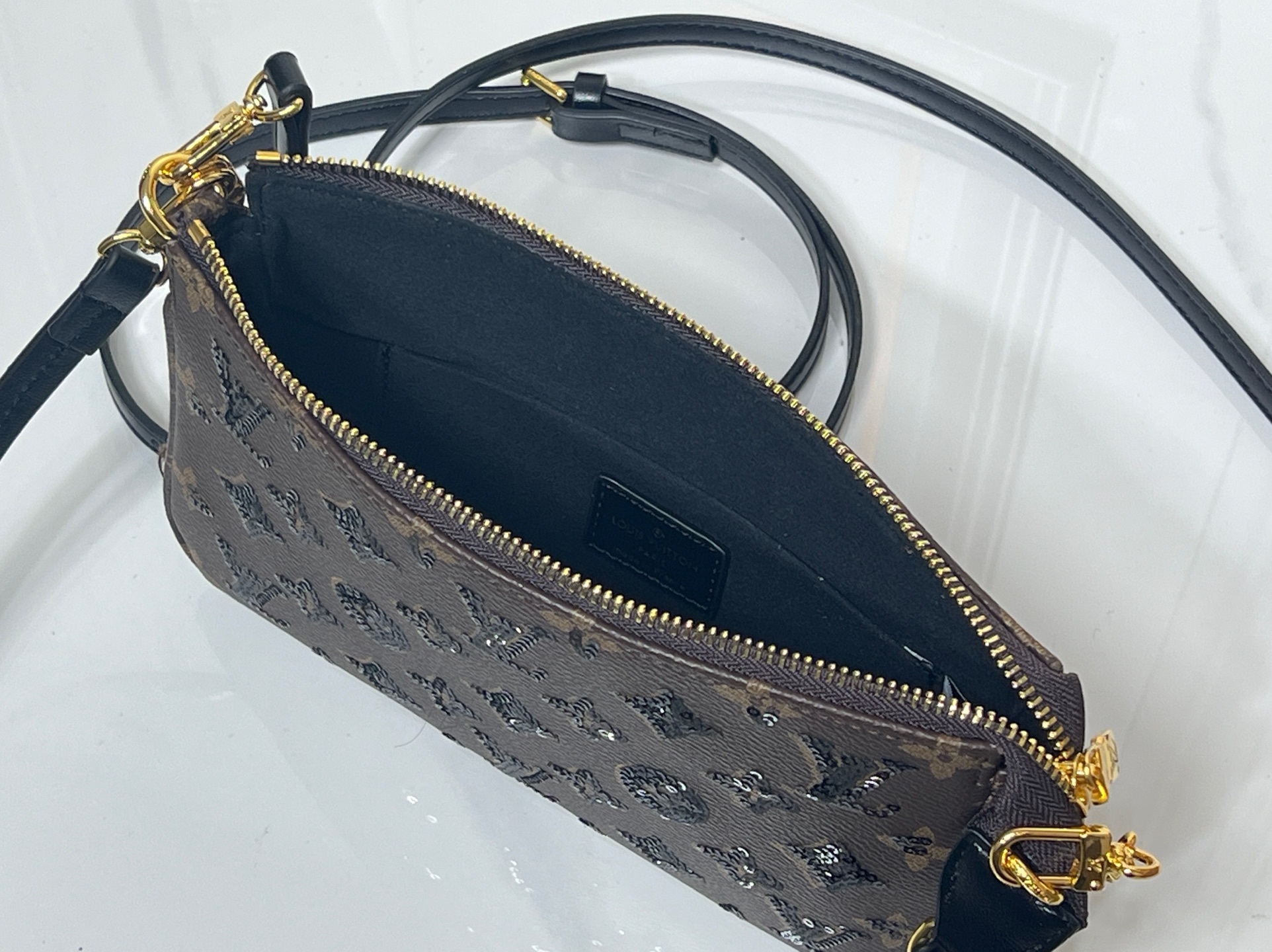 装飾:表面にブラックスパンコールを散りばめ、光の加減で煌めきを表現。縁取り部分は牛革(ダミエ柄)で仕上げ、質感のコントラストを強調。