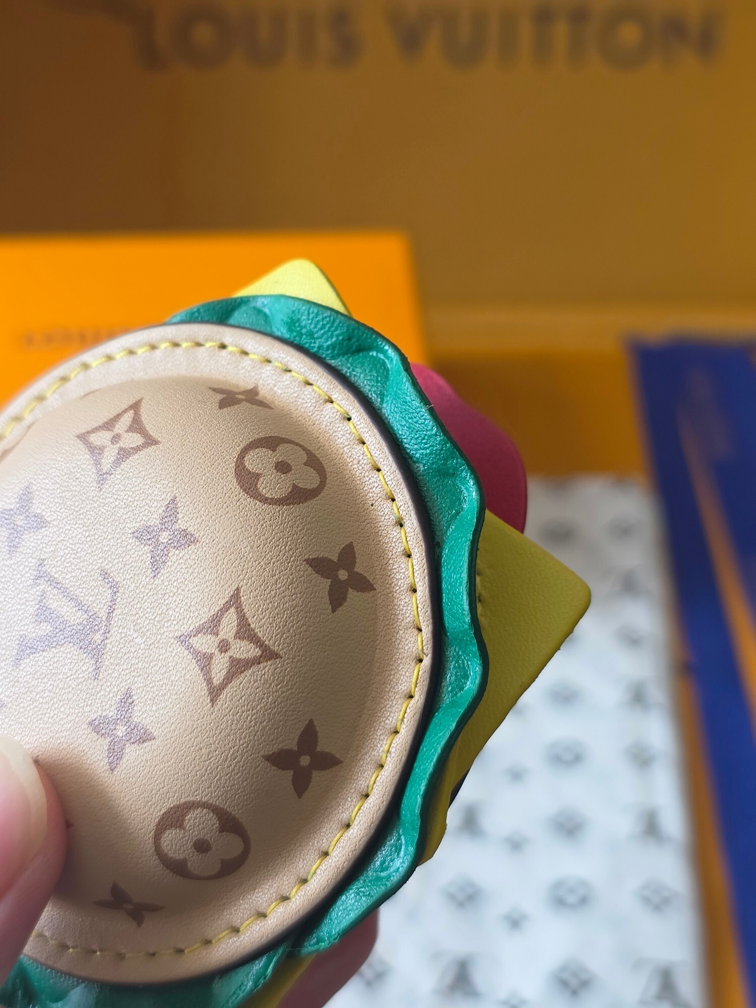パティ層: 柔らかな小牛皮を使用し、立体形状を再現。表面にはUV印刷モノグラムを施し、耐久性と高級感を両立。