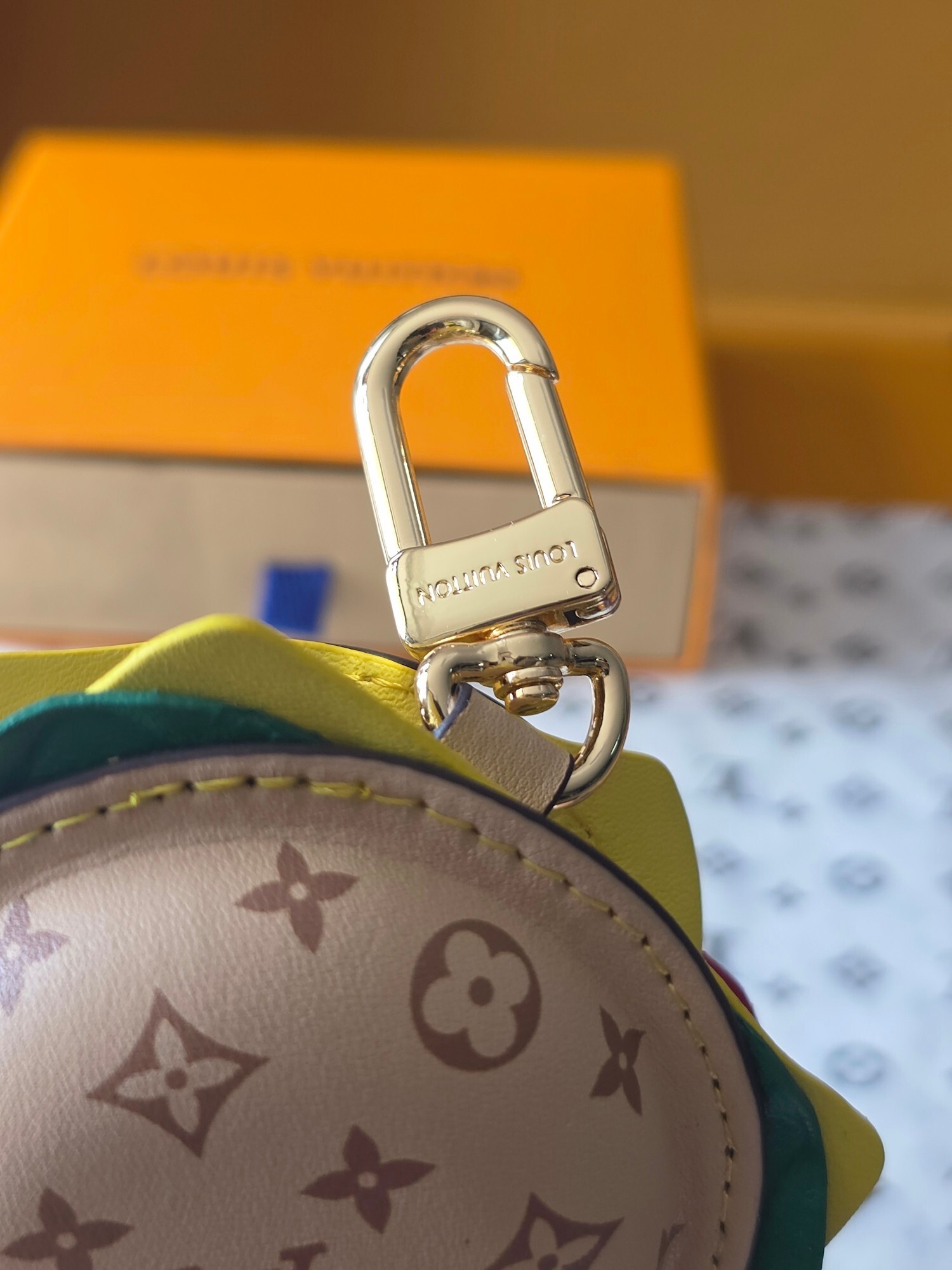 LV金属フック: ハンバーガーのストロー部分に装着されたLVモノグラム刻印フックで、バッグや衣類に簡単に取り付け可能。