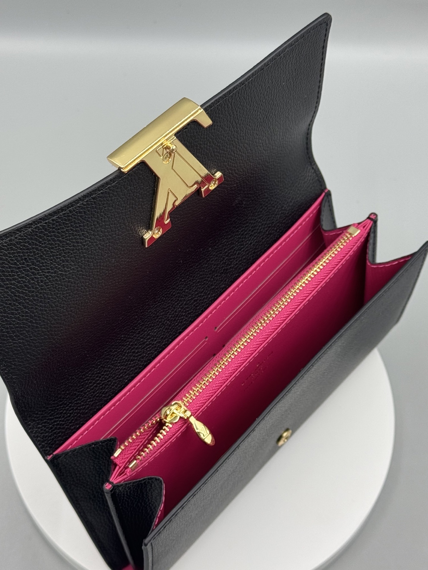 LVの象徴的な「カプシーヌ」コレクションから登場した、ファッション性と実用性を極めた高級財布。鮮烈な色彩と洗練されたシルエットが融合し、「クラシックなスーツからアヴァンギャルドなストリートウェアまで、あらゆるスタイルに瞬時に溶け込む」をデザイン哲学に掲げ。閃くパラジウム金装飾がアクセントとなり、持つ者の個性を引き立てる「日常使いのアクセサリー」として開発されました。
