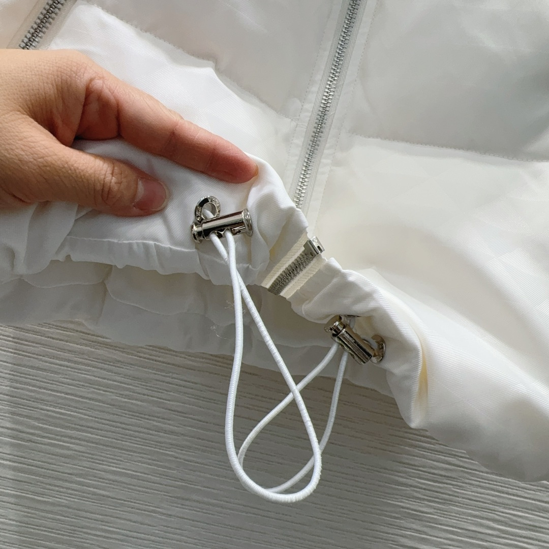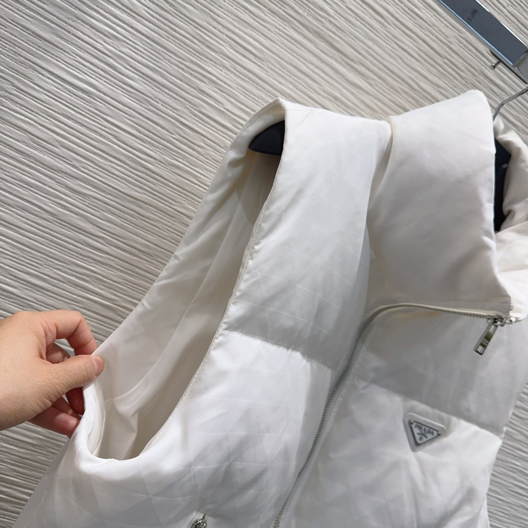 ベスト本体は、三角格子パターンのジャカード生地を採用。プラダの卓越した織物技術が生み出す、立体的で光沢のあるテクスチャーが特徴です。三角格子はクラシックでありながらもモダンな印象を与え、どんなアウターとも調和し、着る人のスタイルを引き立てます。生地の高密度な編み目は、風を通しすぎず、秋冬の冷えから守る保温性も兼ね備えています。