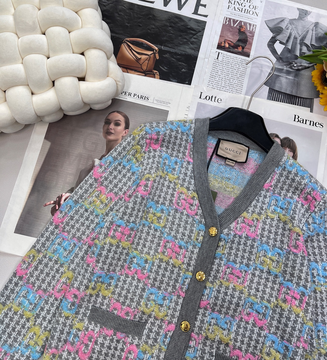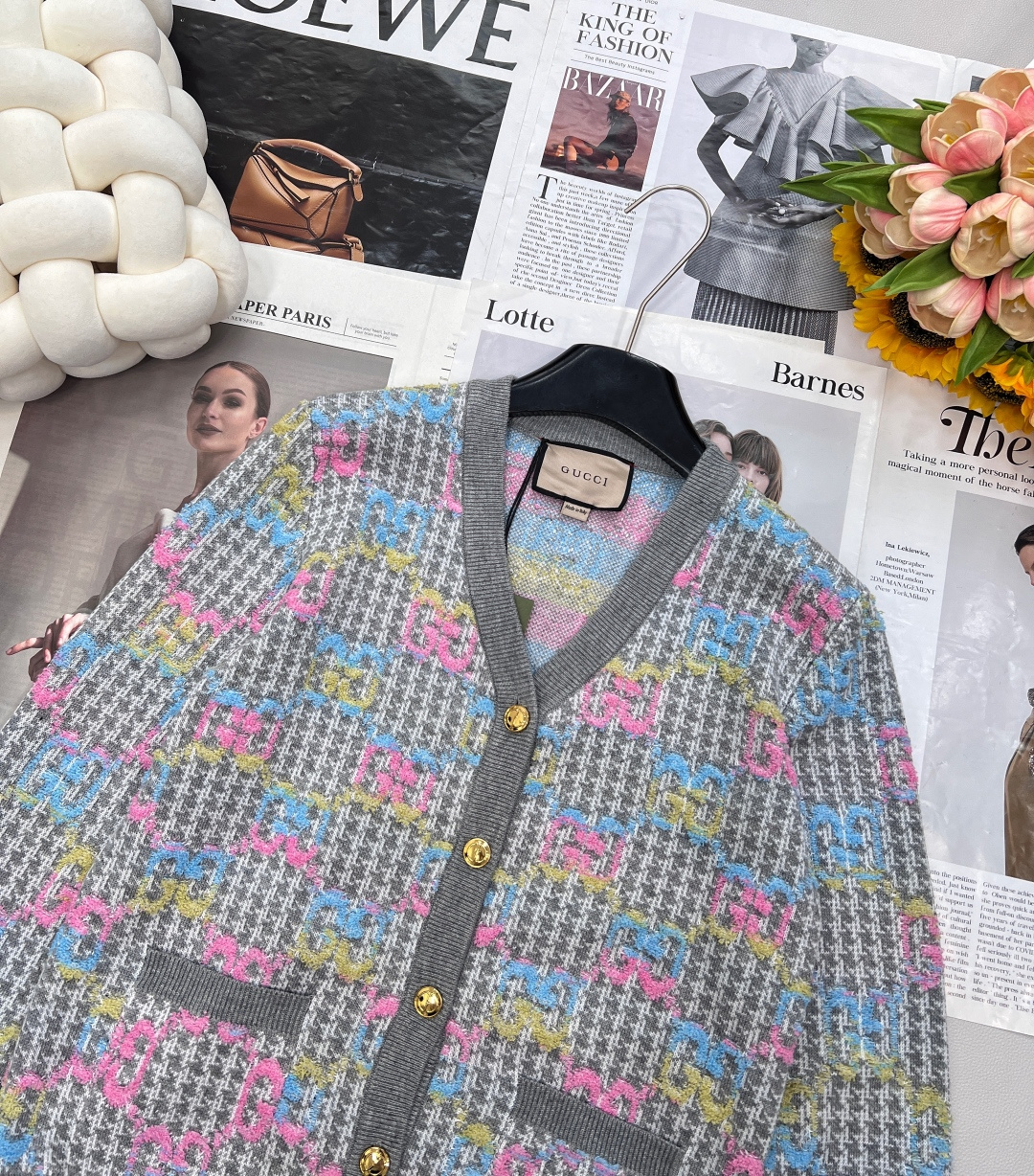 【GUCCI】2025春夏新作 カラフルジャカードニットウールVネックカーディガン|クラシックGG柄の至高の職人技