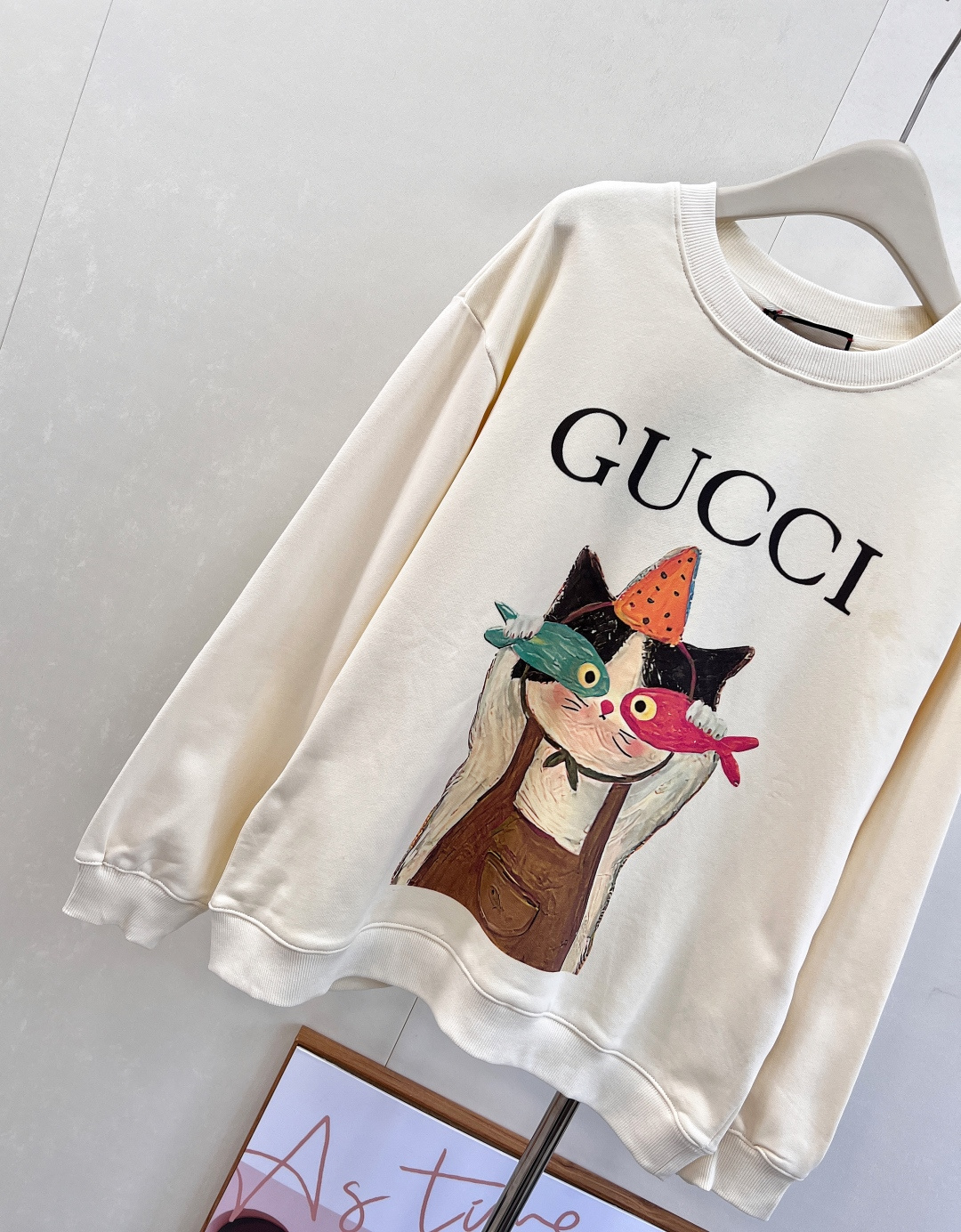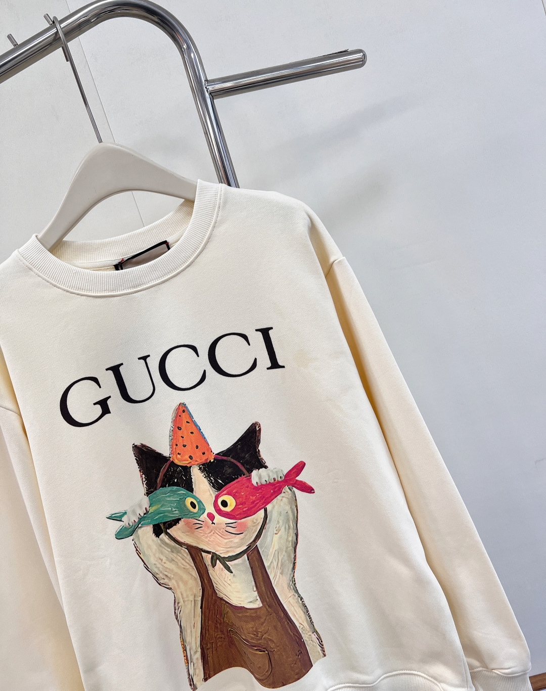 【GUCCI】早秋新作 カートゥーン猫&魚プリントロゴカラフルクルーネックスウェットシャツ|減齢アカデミースタイルの万能アイテム