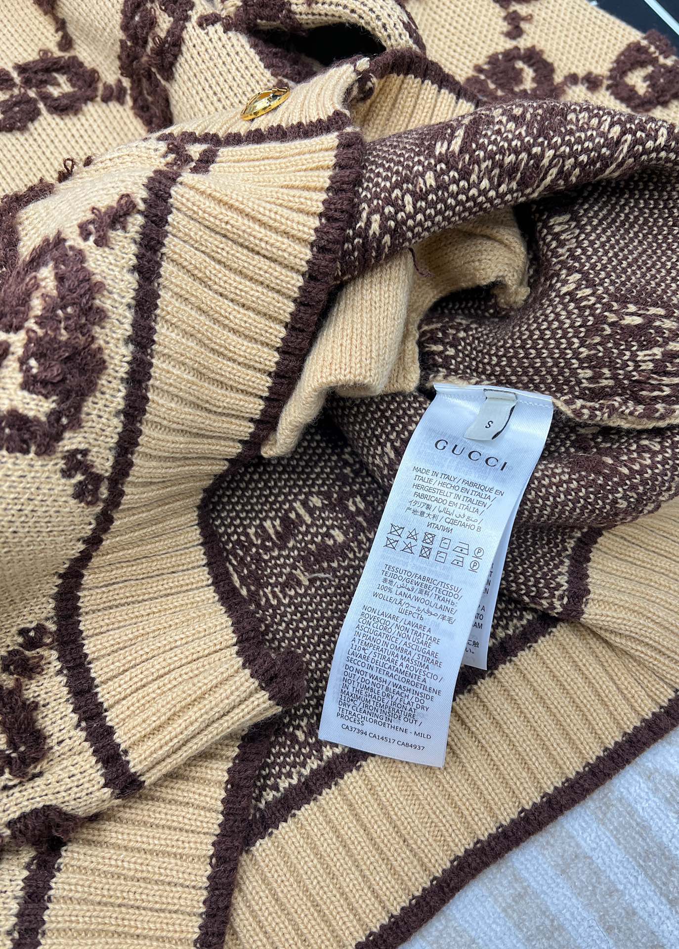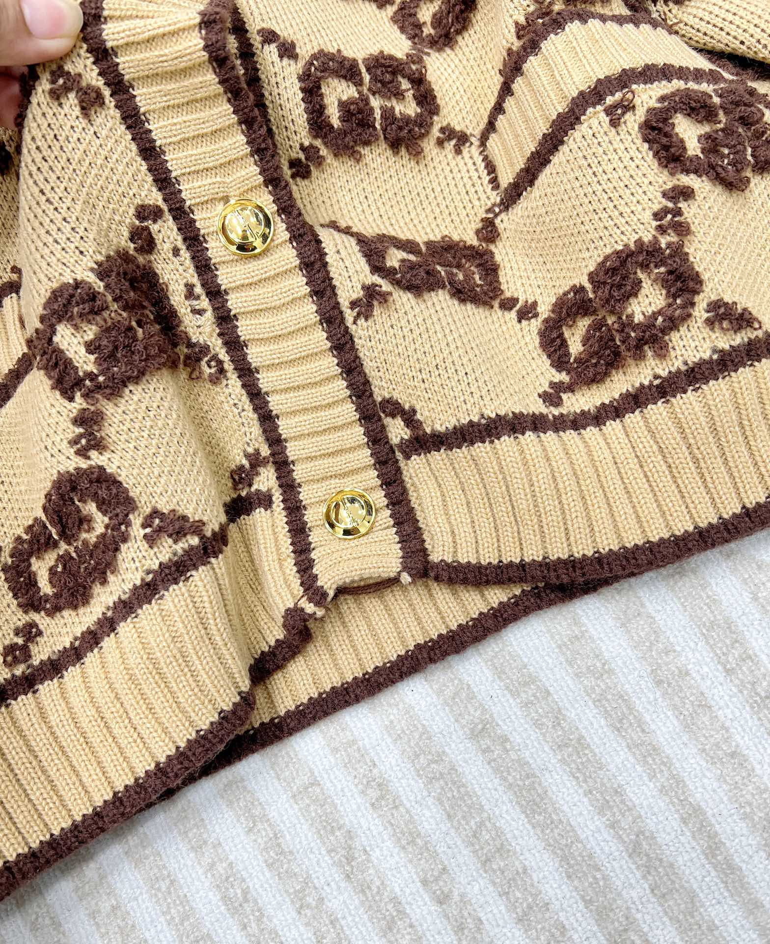 「GGジャカード柄が繊細で、触ると高級感が伝わってきます。Mサイズを着用したところ、Vネックが首元をスッキリ見せてくれて、同僚から『今日のカーディガン、センス良い!』と褒められました♪ カーキ系の色合いは秋の雰囲気にぴったりで、ウール素材が暖かくて、秋から冬にかけて活躍しそうです!」