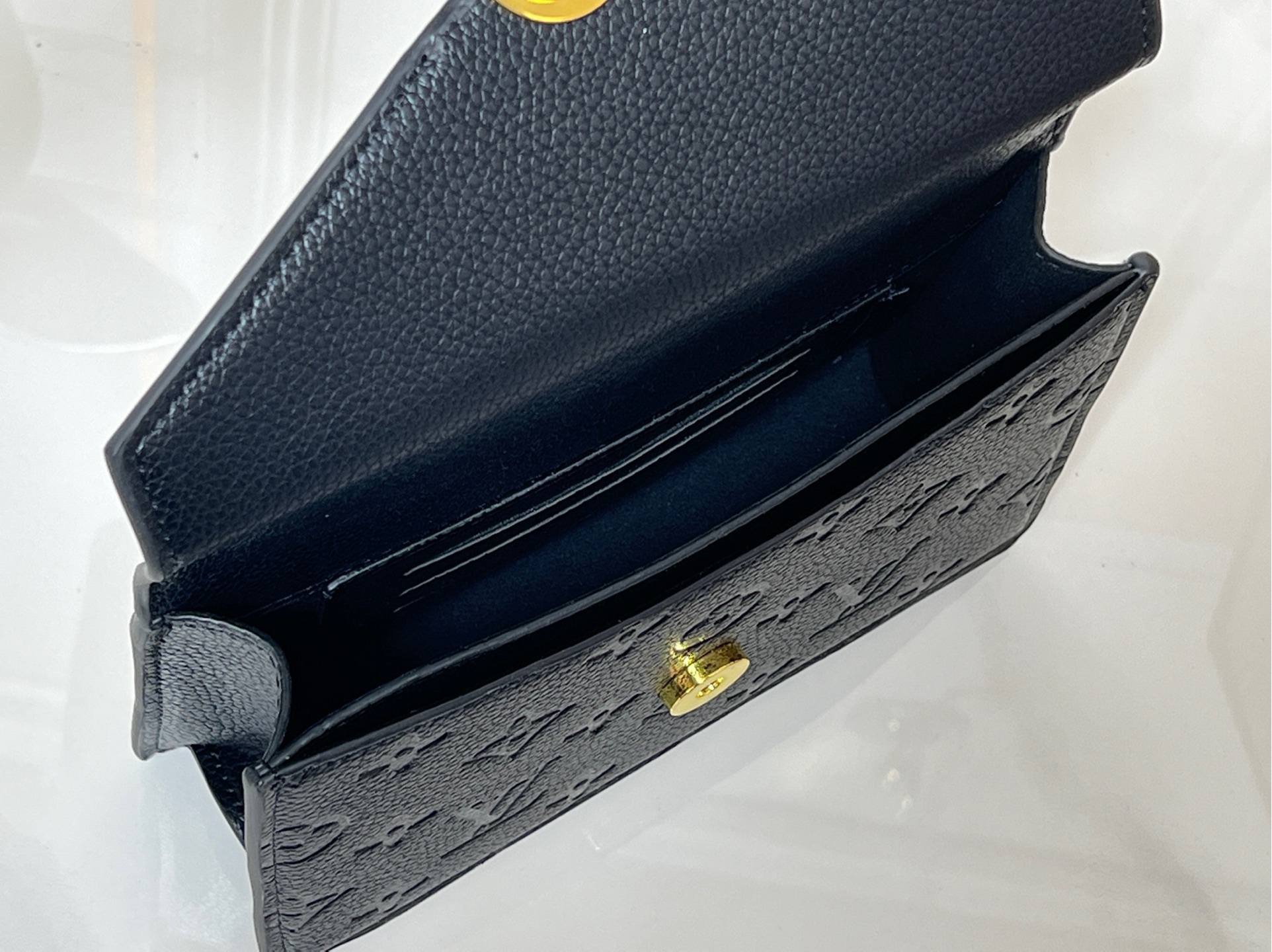 フラップの留め具にはマグネット式仕様を採用。軽く押すだけでスムーズに開閉でき、中に収納されたモノグラムフラワー(ブランドの象徴的花モチーフ)がサプライズで現れます。この「開ける瞬間の喜び」は、日常使いに「特別感」をプラスし、他のウォレットとの差別化を図るポイントです。