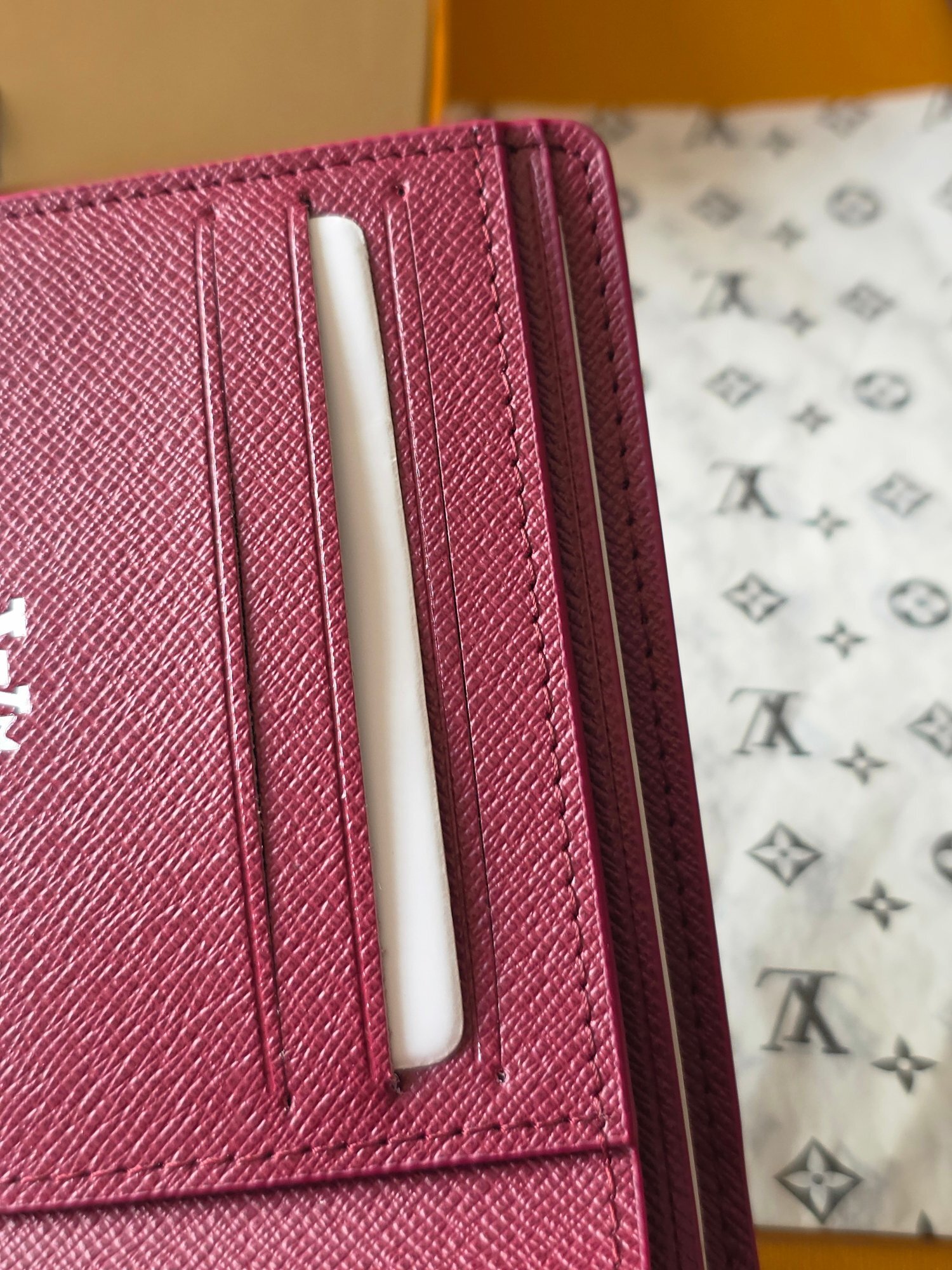 フォルム:スリムで長方形のフォルムは、手のひらに収まりやすく、財布として持つだけでなく、ジャケットの内ポケットやバッグの小物入れにもすっきり収納可能。縁取りのステッチは丈夫な糸を使用し、長期間の使用に耐える耐久性を確保。