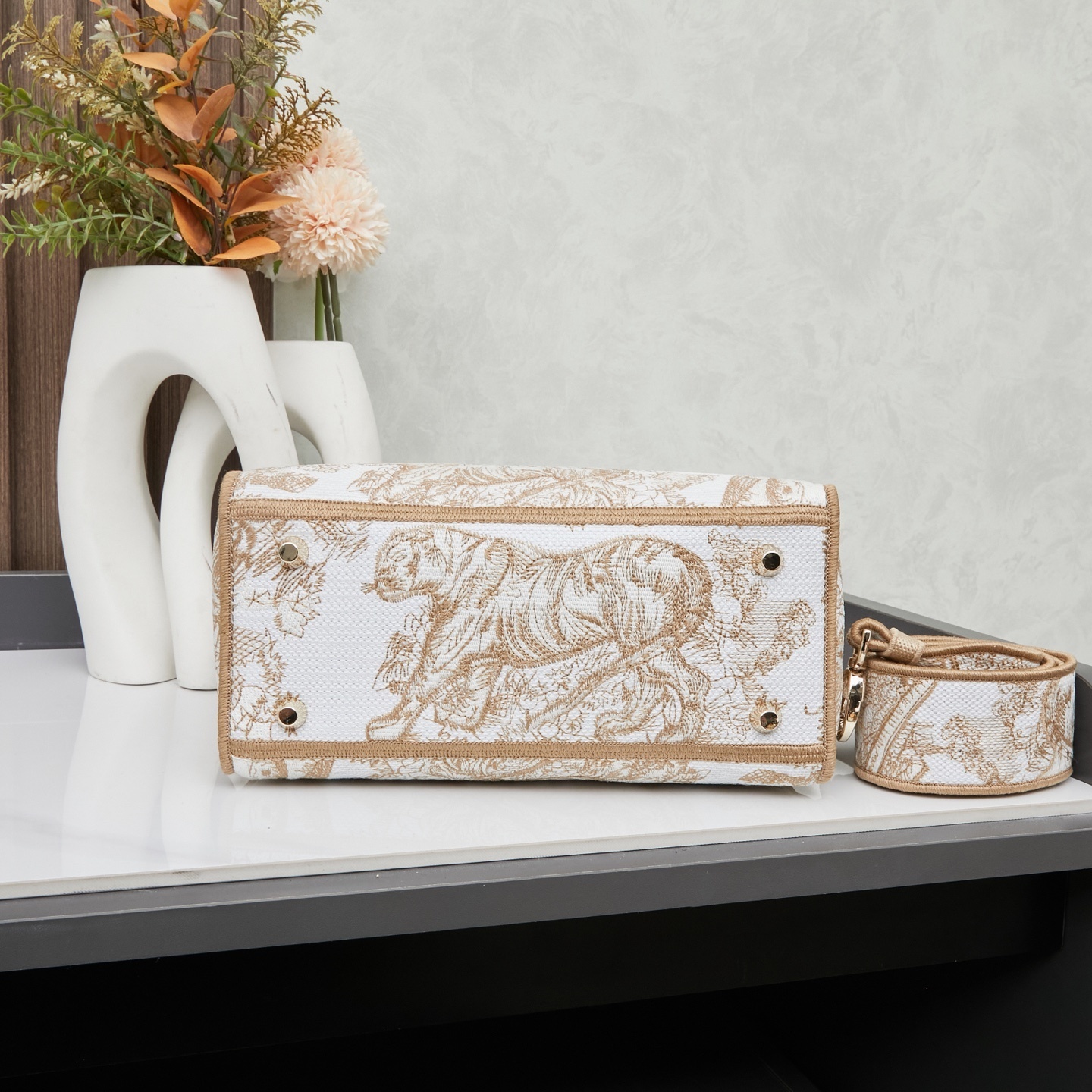 Lady D シリーズは「女性の優雅さを象徴する」ブランドの看板コレクションです。この刺繍シリーズは、その哲学に「自然との共生」を加え、刺繍の手仕事の温もりと布地の柔らかさが生む「新たなエレガンス」を追求。ライトゴールドの色調、蔓の刺繍、二重ストラップの実用性が融合し、「持つだけで自然の息吹を感じる」アイテムとしてデザインされました。