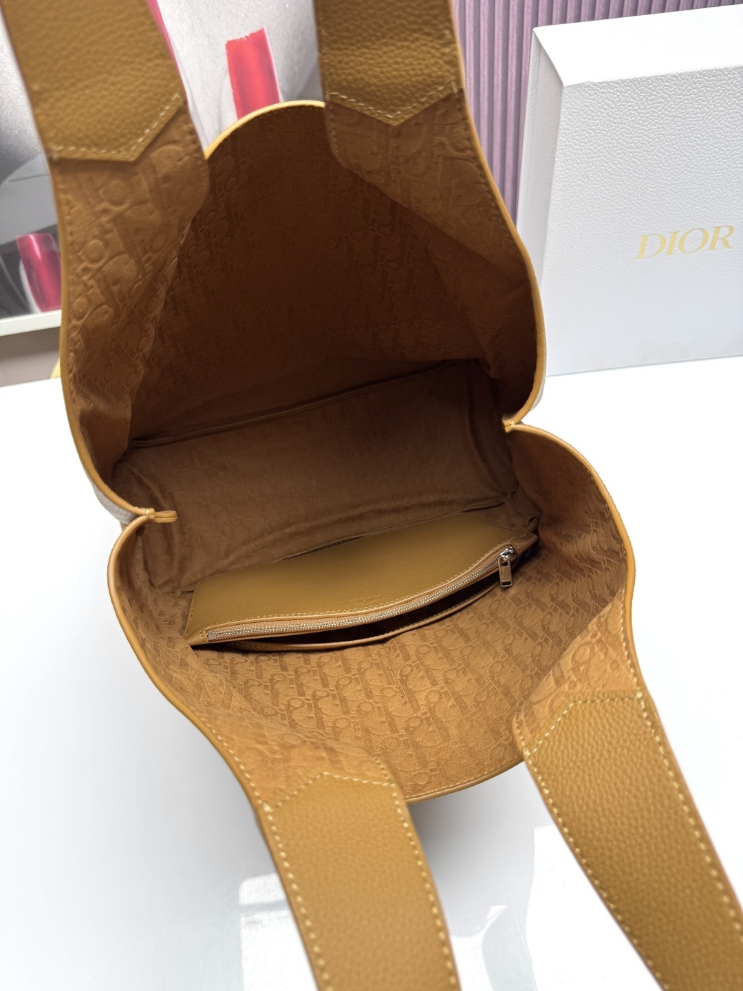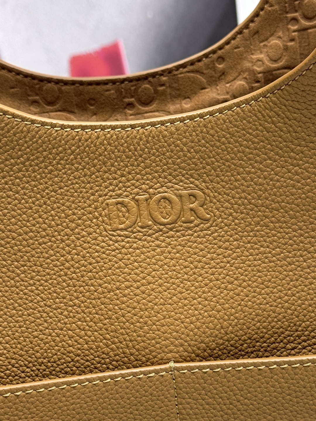 内部Dior圧花ロゴ:メインコンパートメントの内側には「Dior」の文字を圧花(凹み印刷)で刻印。持ち主だけが見ることができる「秘密のブランドアピール」が、特別な気分を演出します。