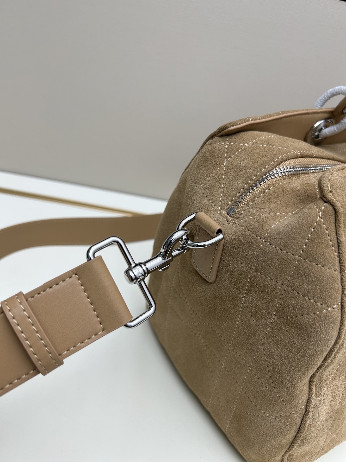 バッグ全面には超大サイズのダイヤモンドキルティング(菱格)を施しました。深く刻まれたステッチが立体的な陰影を生み出し、光の当たり方で「動きのある表情」を演出。シンプルなトラベルバッグのフォルムに「モダンなアクセント」を加え、他のアイテムとの差別化を図ります。