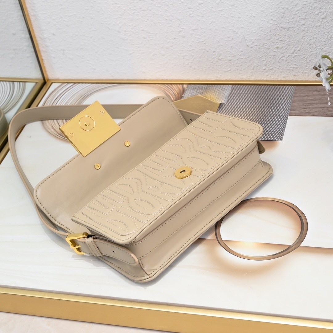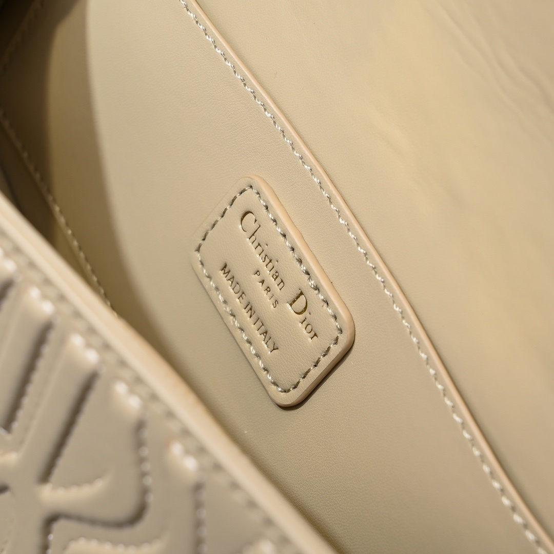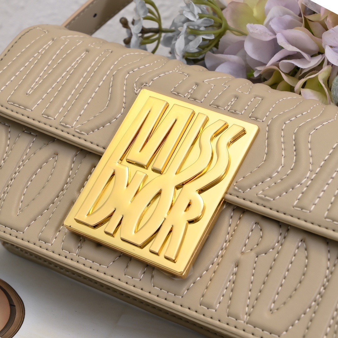 フラップ部分にはコントラストの強いレトロゴールドメッキのメタルプレートを配置。プレート中央に刻印された「Miss Dior」ロゴは、シャープな彫刻と控えめな光沢が「知的なエレガンス」を添え、アイボリーの地味さを「力強く引き立てます」。プレートの縁には繊細な彫金を施し、「職人技の温もり」を感じさせます。