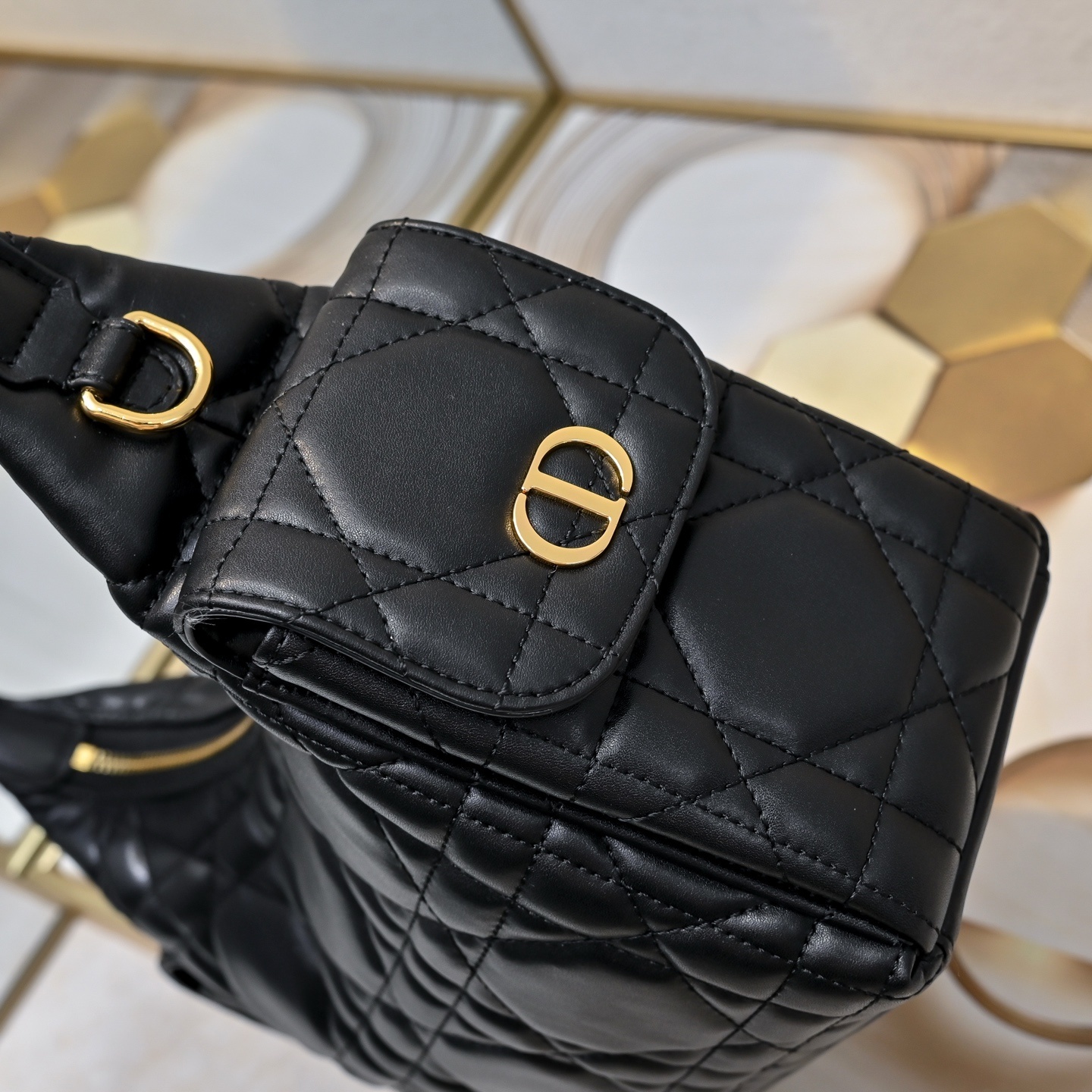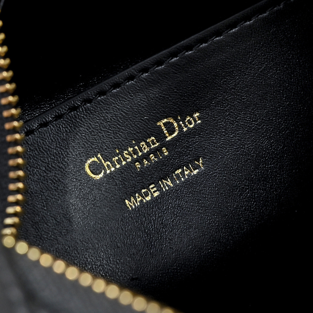 サイドポケットの磁性フラップ部分にはゴールドメッキの金属製CDロゴを配置。シャープな彫刻と控えめな光沢が、ブラックシープスキンの地味さを「力強く引き立て」、ブランドのアイデンティティを「さりげなく主張」します。