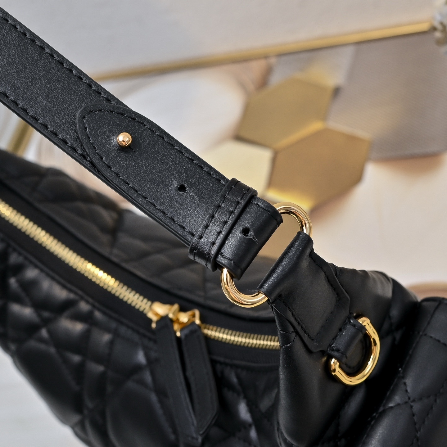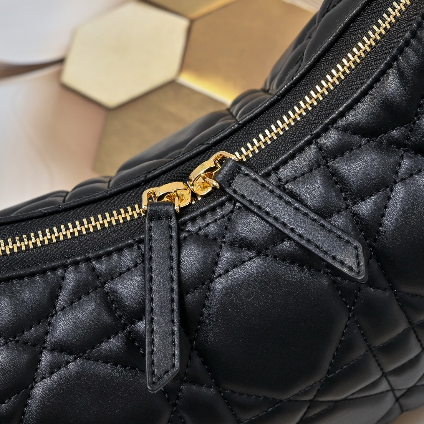 バッグ全面には「特大サイズのカンバセラージュ(藤格纹)ステッチ」を施しました。ディオールの象徴である藤格紋を通常より大きくデザインし、シープスキンの柔らかさと対比させることで「視覚的なインパクト」を生み出します。ステッチの立体感が手触りにも反映され、「職人技の温もり」を感じられる仕上げです。